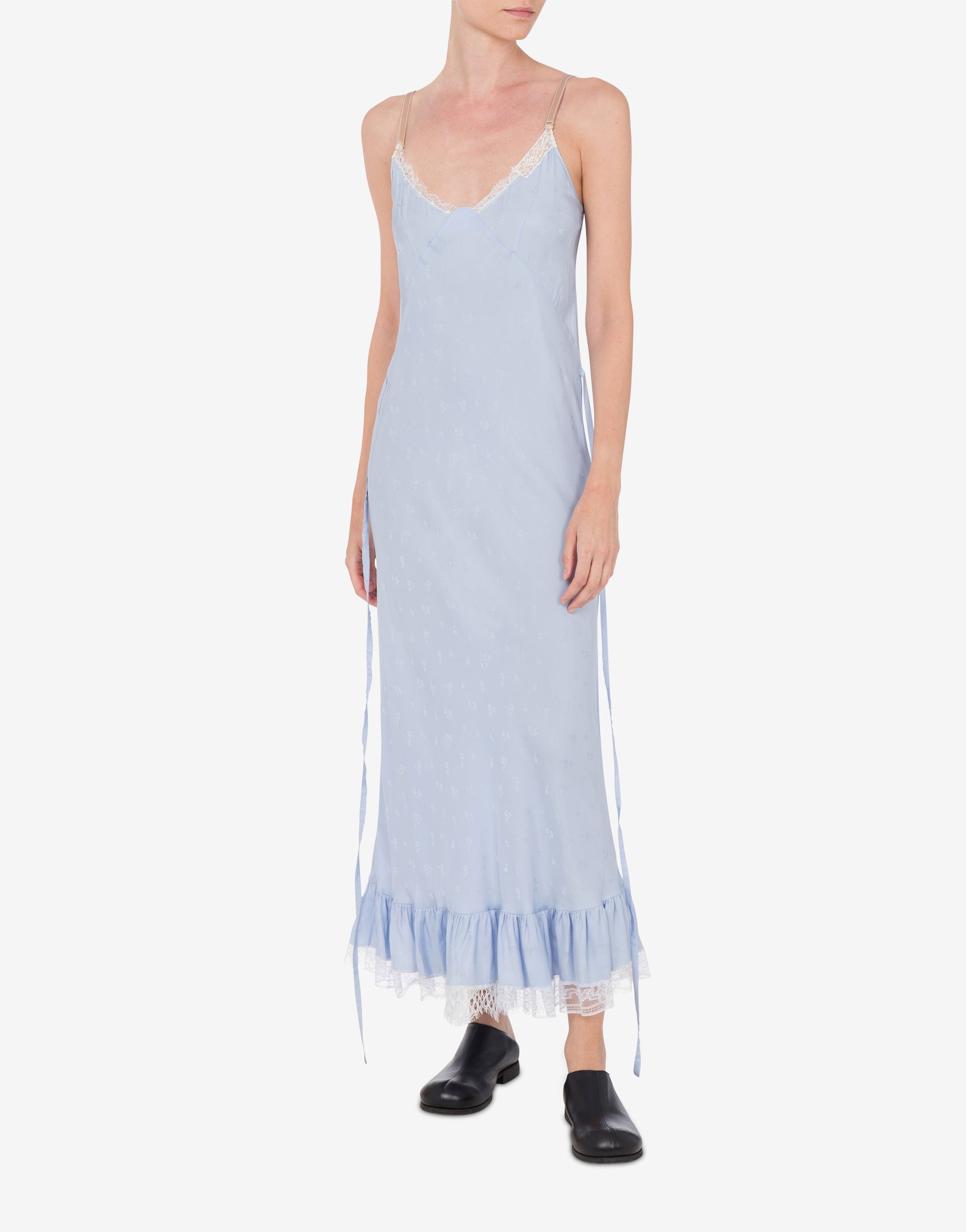 VISCOSE AND SILK SLIP DRESS WITH ALL-OVER MINI JACQUARD FLORAL EMBROIDERY AND WHITE LACE DETAILS. FLOWY DESIGN WITH A SOFT HEM. PRODUCT DETAILS REGULAR FIT - MINI WAIST TIE - V-NECK - SLEEVELESS - ADJUSTABLE AND ELASTIC STRAPS FABRIC: 79% VISCOSE, 21% SILK SKU: AEF251E V042205550293 FITTING & DIMENSIONS - MODEL HEIGHT: 180 CM - MODEL BUST: 80 CM - MODEL WAIST: 60 CM - MODEL HIPS: 89 CM - MODEL SIZE: 40