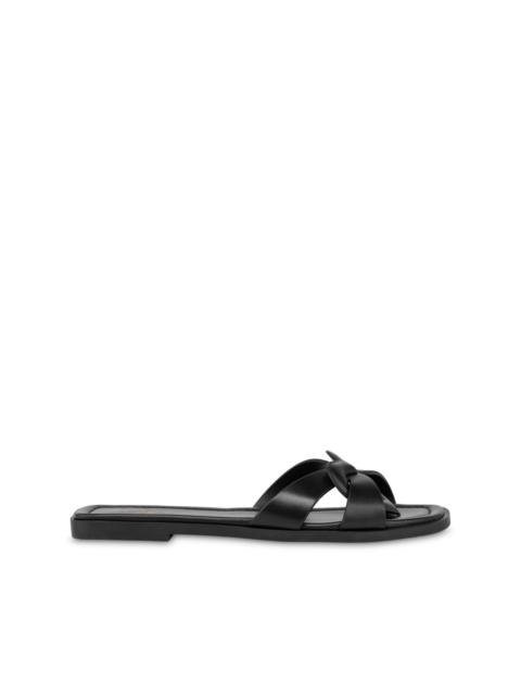 leather slides Highlights - Black - Calf leather - Brushed finish - Slip-on style - Square open toe - Branded footbed - Flat rubber sole Imported Composition Leather 100%
