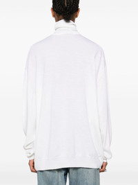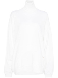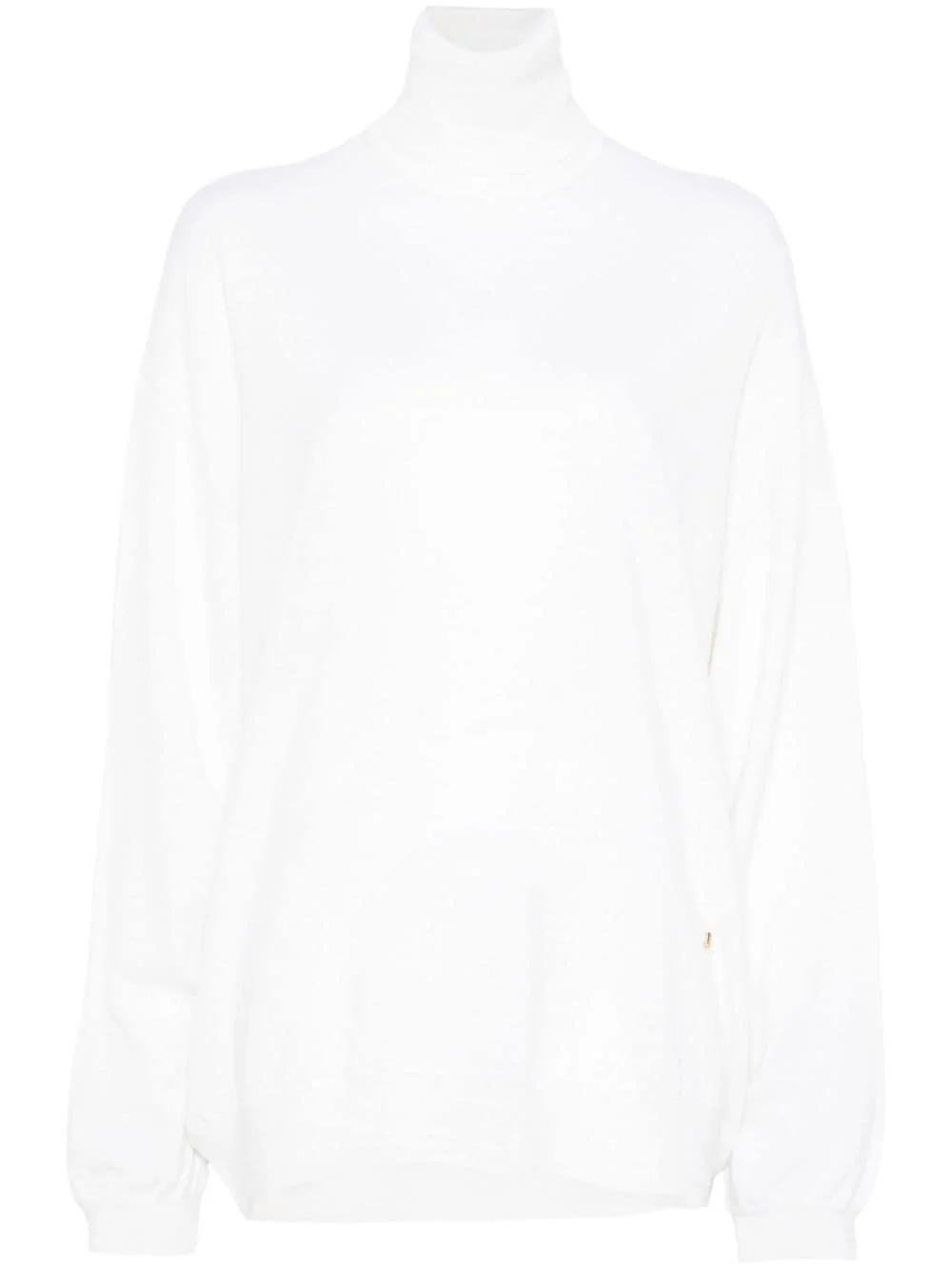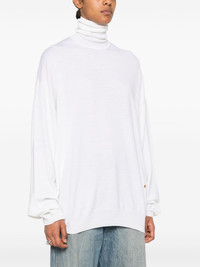 Golden M sweater Highlights - White - Virgin wool - Knitted construction - Ribbed roll neck - Drop shoulder - Long sleeves - Golden m logo charm - Ribbed cuffs and hem Made in Italy Composition Virgin Wool 100% SIZE & FIT Model measurements Height 5 ft 10 in(1.77 m) Bust/Chest 33.07 in(84 cm) Hips 37 in(94 cm) Waist 24.8 in(63 cm) FittingInformation Designed for an oversized fit, offering additional room throughout Made with a midweight knit, this piece offers some stretch Washing instructions Hand Wash