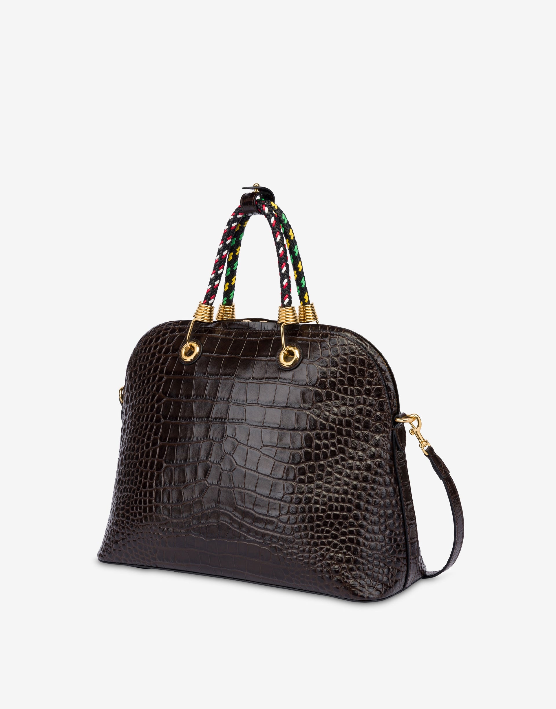 HANDBAG IN CROCODILE-PATTERNED GOAT LEATHER, WITH BRAIDED CALFSKIN HANDLES FEATURING A ROPE EFFECT REMINISCENT OF SCOOBY DOO KNOTS, CUSTOM-MADE FOR MOSCHINO. SPIRAL GOLD-PLATED HOOKS, WHICH SERVE AS HANDLE ATTACHMENTS, EMBELLISH THE BAG. PRODUCT DETAILS - MULTICOLOR HANDLES - LOGO EMBOSSED ON THE FRONT - REMOVABLE LEATHER TAG - HANDLES CREATED WITH MULTIPLE MACHINE-ASSEMBLED THREADS - REMOVABLE AND ADJUSTABLE STRAP WITH BUCKLE - ZIP CLOSURE WITH DOUBLE PULL TAB - LINED INTERIOR WITH ZIP POCKET AND SMALL PATCH POCKET LINING: 100% COTTON - UPPER: 100% GOATSKIN SKU: POLMC4114PP1MOC0307 FITTING & DIMENSIONS - DEPTH: 14 CM - WIDTH: 35 CM - HEIGHT: 27 CM