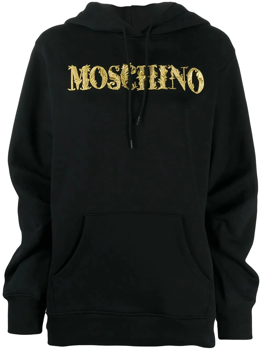 logo embroidery hoodie It's time to add some refinement to your casual style. Designed with a gold-tone embroidered logo on the chest, this Moschino hoodie will make you stand out in the streets. All hail the streetwear queen! Made in Italy Composition Cotton 100% SIZE & FIT Model measurements Height 5 ft 10 in(1.79 m) Bust/Chest 32.67 in(83 cm) Hips 35.03 in(89 cm) Waist 24.8 in(63 cm) FittingInformation This piece fits true to size. We recommend you get your regular size Cut for a loose fit Made with a mid-weight fabric Washing instructions Machine Wash