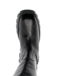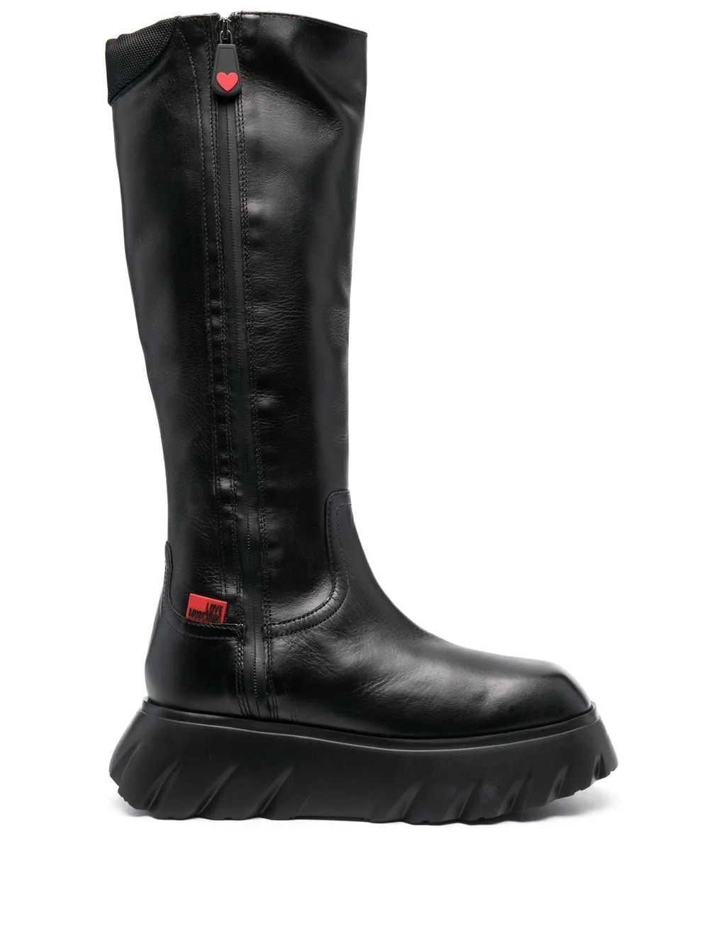 logo-patch boots Love Moschino exhibits a contemporary style with these knee-high boots. This design is made instantly recognisable with the inclusion of a logo patch to the side for a branded finish. Imported Composition Leather 100% SIZE & FIT Measurement CIRCUMFERENCE 14.56 in(37 cm) HEEL 2.36 in(6 cm) HEIGHT 14.96 in(38 cm) PLATFORM 1.57 in(4 cm)