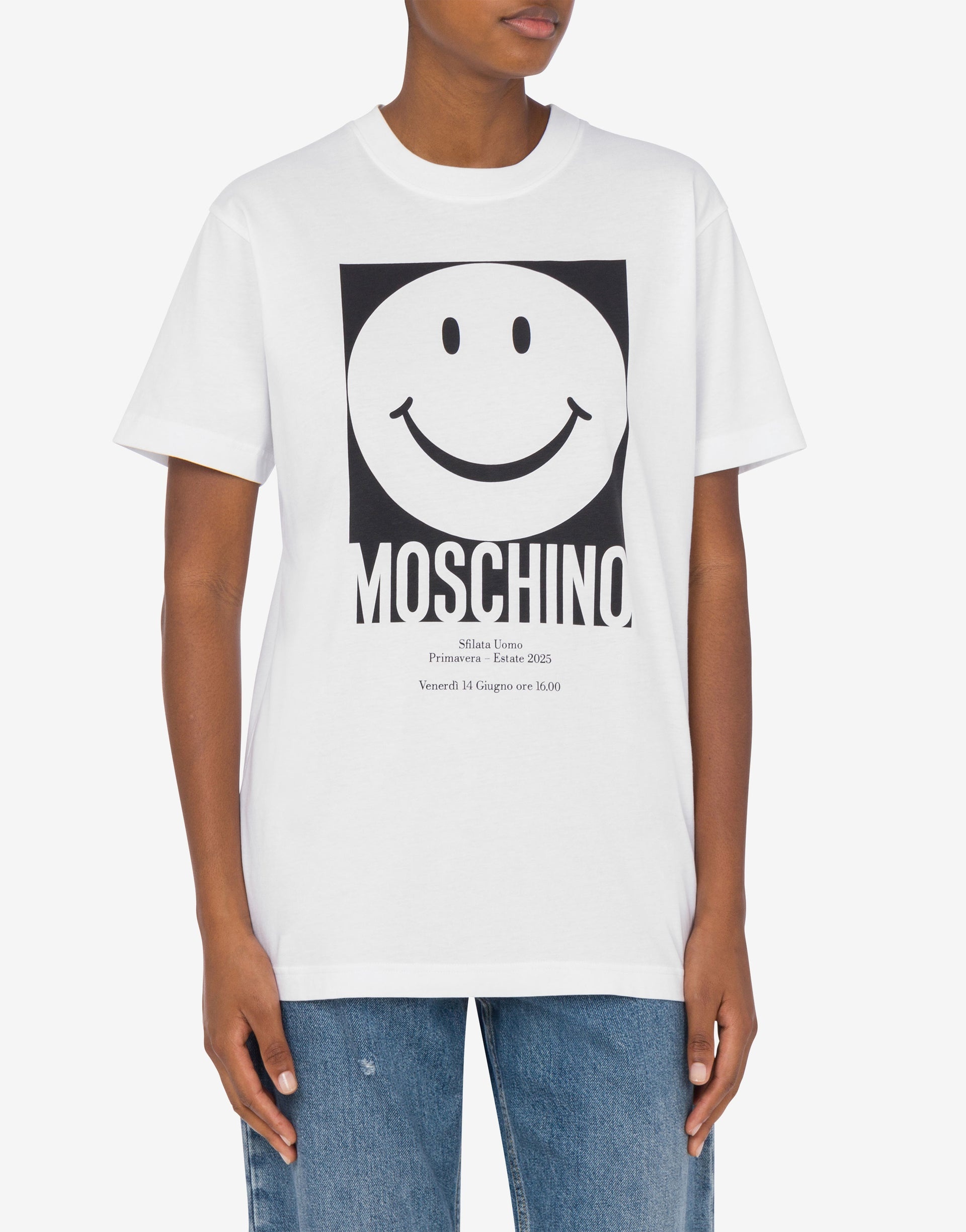 ORGANIC COTTON JERSEY T-SHIRT WITH SMILEY® PRINT ON THE FRONT. PRODUCT DETAILS - CREATED IN COLLABORATION WITH SMILEY® - SHORT SLEEVES - DROPPED SHOULDERS FABRIC: 100% COTTON SKU: AEF251E J071605411001 FITTING & DIMENSIONS - MODEL HEIGHT: 180 CM - MODEL BUST: 80 CM - MODEL WAIST: 60 CM - MODEL HIPS: 89 CM - MODEL SIZE: 40