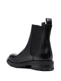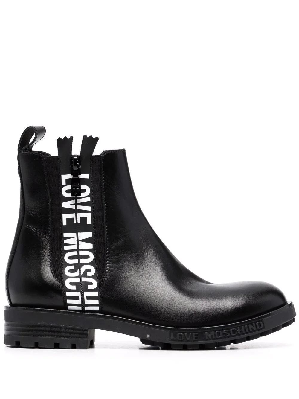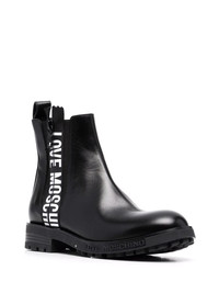 logo-tape Chelsea boots Love Moschino adds a contemporary touch to a Chelsea boot construction with contrasting logo-tape detailing here. Underfoot, a ridged rubber sole continues the modern feel. Imported Composition Leather 100%