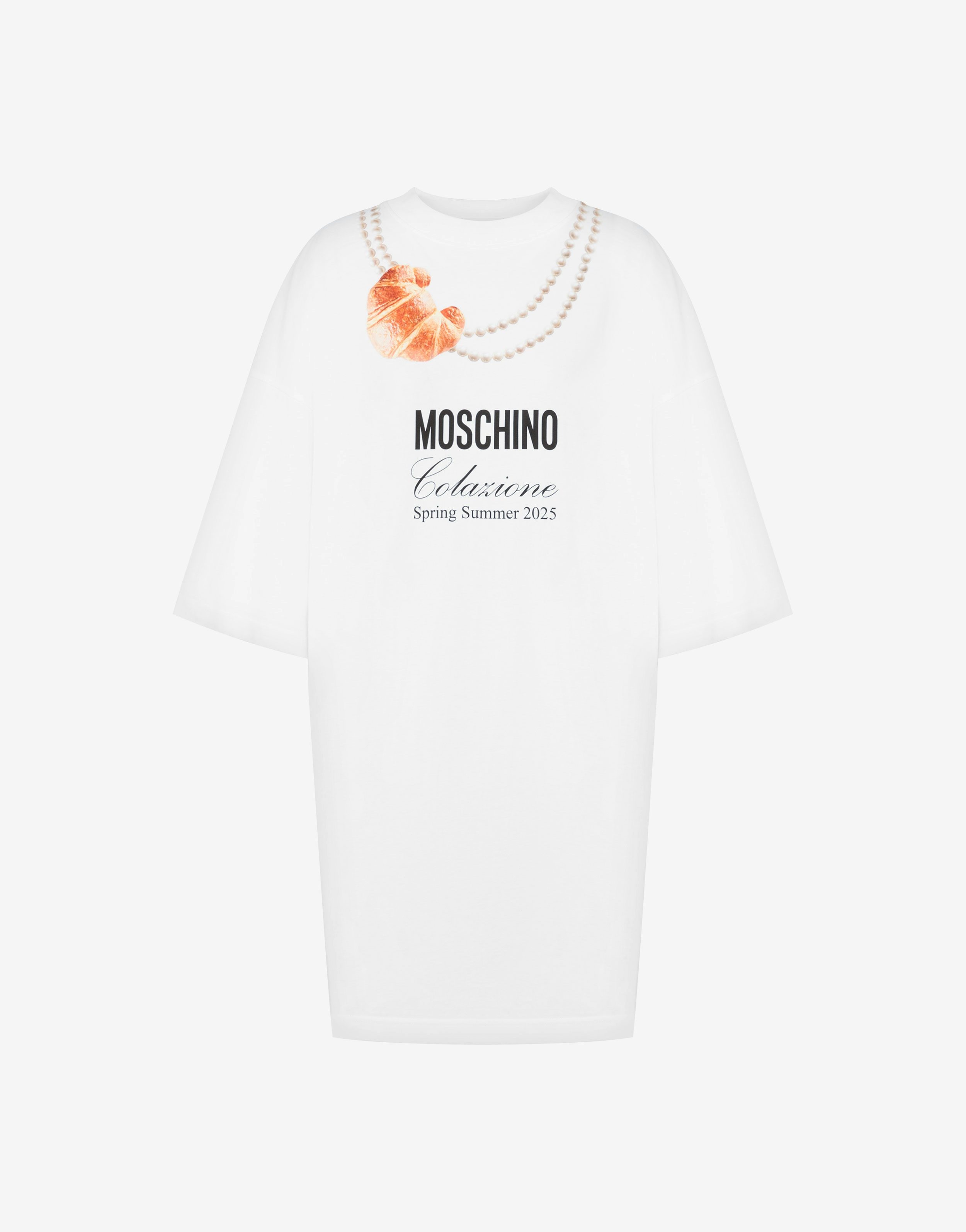 OVERSIZED ORGANIC COTTON JERSEY DRESS WITH CROISSANT NECKLACE PRINT AND MOSCHINO BREAKFAST LOGO. OVERSIZE FIT CREW NECK SHORT SLEEVES DROPPED SHOULDERS FABRIC: 100% COTTON CODE: AEF251E 043805411001