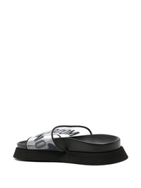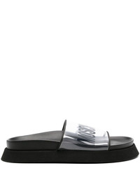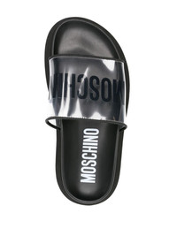 logo-print slides Moschino’s slides are instantly recognisable thanks to the logo print that adorns the transparent straps in bold capital letters. They rest atop a rubber sole and moulded footbed. Highlights - Black - Logo-print transparent strap - Slip-on style - Almond open toe - Branded moulded footbed - Flat rubber sole Imported Composition Outer: PVC 95%, Polyurethane 4%, Polyester 1% Lining: Polyurethane 100% Sole: Rubber 100% SIZE & FIT Measurement HEEL 1.37 in(3.5 cm) Sole height 0.98 in(2.5 cm)