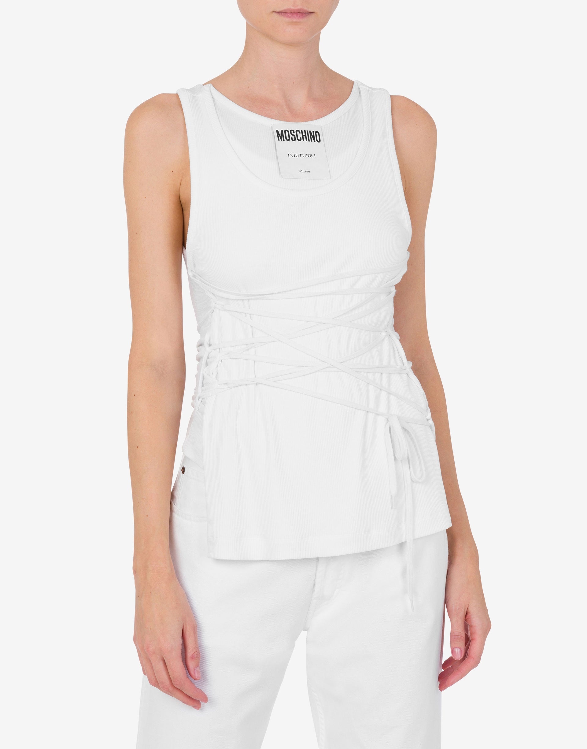 STRETCH COTTON TANK TOP WITH RIBBED DETAILING. THE FRONT FEATURES A TOP WITH TONAL CRISSCROSS LACES. LOGO LABEL IS INTENTIONALLY VISIBLE. PRODUCT DETAILS SLIM FIT - DECORATIVE FRONT LACING FABRIC: 95% VISCOSE, 5% ELASTAN SKU: AEF251D A120604450001 FITTING & DIMENSIONS - MODEL HEIGHT: 180 CM - MODEL BUST: 80 CM - MODEL WAIST: 60 CM - MODEL HIPS: 89 CM - MODEL SIZE: 40