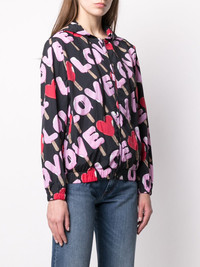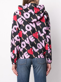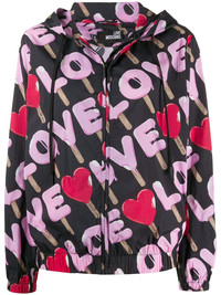 love print rain jacket Black love print rain jacket from Love Moschino featuring a hood with drawstring tie fastenings, a front zip fastening, long sleeves, an elasticated hem and elasticated cuffs. Imported Composition Polyamide 100% SIZE & FIT Model measurements Height 5 ft 10 in(1.78 m) Bust/Chest 34.25 in(87 cm) Hips 35.03 in(89 cm) Waist 26.37 in(67 cm) FittingInformation This piece fits true to size. We recommend you get your regular size Cut for a loose fit Made with a lightweight non-stretch fabric Washing instructions Machine Wash