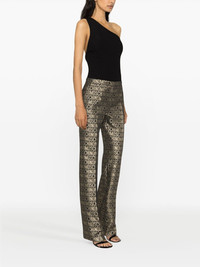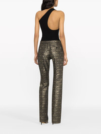 metallic logo-print straight-leg trousers Highlights - Black/gold-tone - Cotton blend - Metallic effect - All-over logo print - Concealed front fastening - Rear welt pocket - Straight leg Made in Italy Composition Outer: Polyester 56%, Cotton 38%, Metal 3%, Polyamide 3% Lining: Acetate 60%, Cupro 40% SIZE & FIT Model measurements Height 5 ft 10 in(1.78 m) Bust/Chest 31.49 in(80 cm) Hips 35.03 in(89 cm) Waist 23.62 in(60 cm) FittingInformation Designed for a straight-leg fit, these trousers allow for a close fit at the waist and an unrestricted, comfortable fit over the leg Made from a midweight non-stretch fabric This piece fits true to size – take your usual size Washing instructions Dry Clean Only