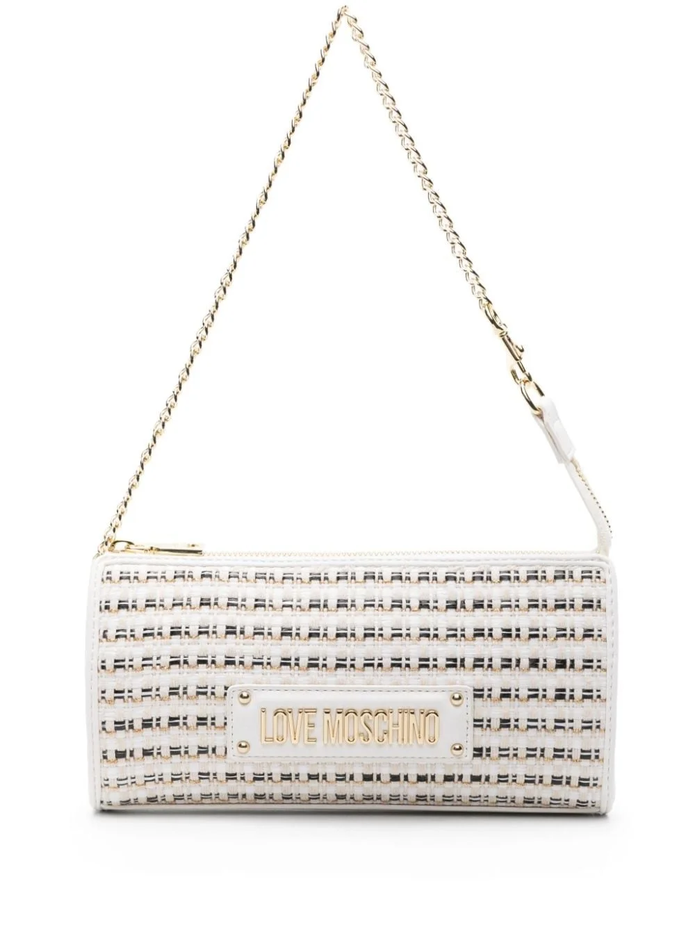 metallic-thread raffia shoulder bag Highlights - White/beige/black - Faux leather - Smooth grain - Woven raffia design - Metallic threading - Gold-tone logo lettering - Branded zip puller - Top zip fastening - Leather and chain-link shoulder strap - Main compartment - Internal logo plaque - Internal card slots - Gold-tone hardware - Full lining - This piece comes complete with a protective dust bag. Imported Composition Outer: Polypropylene 100%, Polyurethane 100% SIZE & FIT Measurement DEPTH 1.57 in(4 cm) HANDLE 8.66 in(22 cm) HEIGHT 4.72 in(12 cm) WIDTH 9.44 in(24 cm)