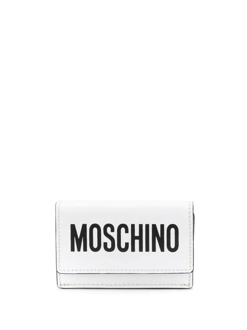 mini logo-print wallet Have a date any time soon? Pay the bill in style with this Moschino wallet. It won't grant you the second date, though, that's entirely up to you. Highlights - White - Calf leather - Logo print to the front - Gold-tone hardware - Press stud fastening - Note compartment - Internal logo stamp Made in Italy Composition Outer: Calf Leather 100%