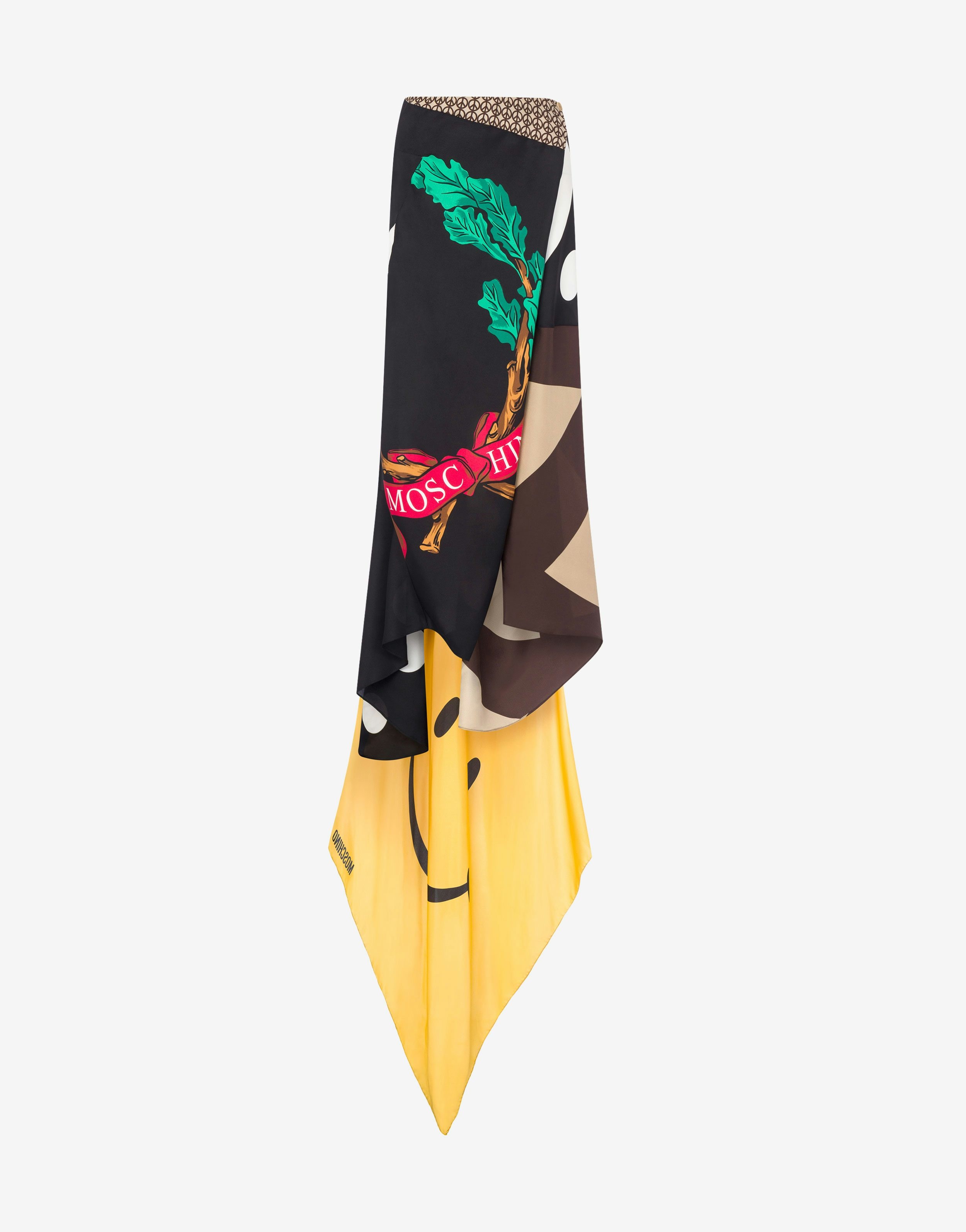 WRAP MIDI SKIRT IN SILK TWILL WITH PATCHWORK EMPHASIZED BY CONTRASTING PRINTS, SUCH AS THE MAXI ARCHIVAL LAUREL CROWN LOGO OR THE SMILEY® ON THE BACK TRAIN. RELAXED FIT MADE IN COLLABORATION WITH SMILEY® SCARF PRINT PEACE SYMBOL PRINT QUESTION MARK PRINT REGULAR WAIST WRAP CLOSURE WITH BUTTON FABRIC: 100% SILK LINING: 60% CELLULOSE ACETATE, 40% VISCOSE CODE: AEF242D 012554602888