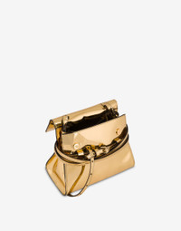 THE RESORT 2026 COLLECTION PRESENTS THE SMALL HANDBAG IN MIRROR-EFFECT FABRIC WITH A LIGHTWEIGHT CONSTRUCTION. DISTINCTIVE FEATURE IS THE DECORATIVE, FULLY REMOVABLE BELT THAT HUGS THE BODY OF THE BAG. PRODUCT DETAILS - LOGO ON FLAP - ROUND HANDLE - ADJUSTABLE AND REMOVABLE SHOULDER STRAP - MULTIPLE PORTABILITY - MAGNETIC CLOSURE - LINED INTERIOR WITH SMALL PATCH POCKET LINING: 100% COTTON - UPPER: 60% POLYURETHANE, 40% POLYESTER SKU: POLMC4005PP1OOG1901