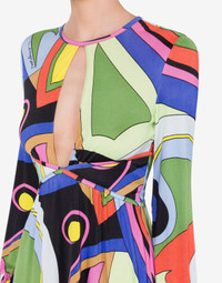 Viscose jersey dress with all-over multi-colour print and cut-out front. - Slim fit - Printed piping on the waist - Central cut-out on the chest - Crew neck - Long sleeves - Smock stitch on cuffs - Mini-ruffled sleeve hems - Concealed zip fastening on the side Fabric:100% Viscose Code: AEF231E 044005561888 FIT - Slim fit - Model bust size : 82 - Model height : 1.78 cm - Model Hips : 88 cm - Model size : 40 - Model waist : 60 cm