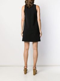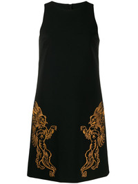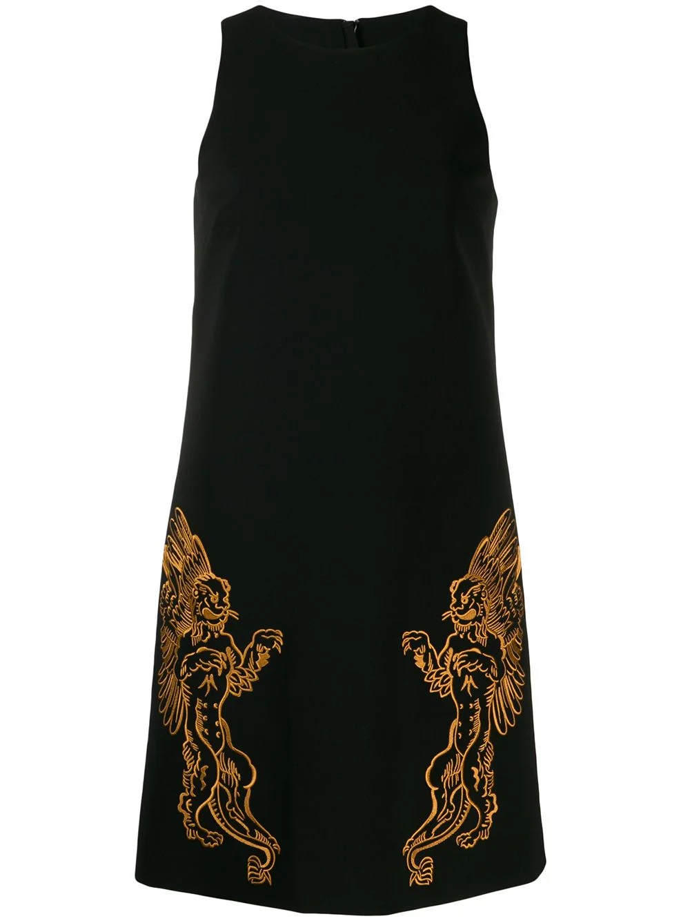 Mythological creatures crepe dress The flamboyant Moschino mode continues to be the perfect combination of pop culture humour and high-end Italian construction, as seen in this black Mythological creatures crepe dress. Featuring a round neck, a sleeveless design, a back zip fastening, an a-line shape, a short length and contrasting gold-tone embroideries on the front. Made in Italy Composition Outer: Polyester 89%, Polyurethane 11% Lining: Cupro 94%, Spandex/Elastane 6% SIZE & FIT Model measurements Height 5 ft 10 in(1.77 m) Bust/Chest 35.03 in(89 cm) Hips 35.03 in(89 cm) Waist 23.62 in(60 cm) FittingInformation This piece fits true to size. We recommend you get your regular size Cut for a relaxed fit Made with a mid-weight fabric Washing instructions Dry Clean Only