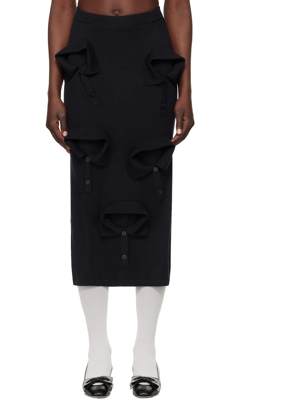 Knit merino wool midi skirt. Spread collar-style appliques throughout. Rib-knit waistband and hem. Supplier color: Dark blue 100% merino wool. Made in Romania 251720F093000