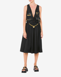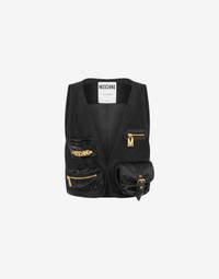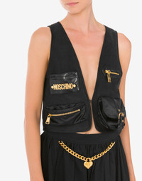 Heavy satin cropped gilet with mini bag-effect nylon pockets and gold-electroplated details. - Cropped Fit - Two nylon pockets with mini-bag effect - Pocket with buckle-adjustable strap - Pockets with metal logo lettering - Pocket with zip and gold-electroplated M pull-tab - Lined interior Fabric:100% Lyocell Lining:48% Cellulose acetate, 52% Cupro Code: AEF241E 100205131555 FIT - Cropped Fit - Model bust size : 82 - Model height : 1.78 cm - Model Hips : 88 cm - Model size : 40 - Model waist : 60 cm