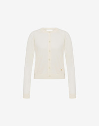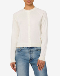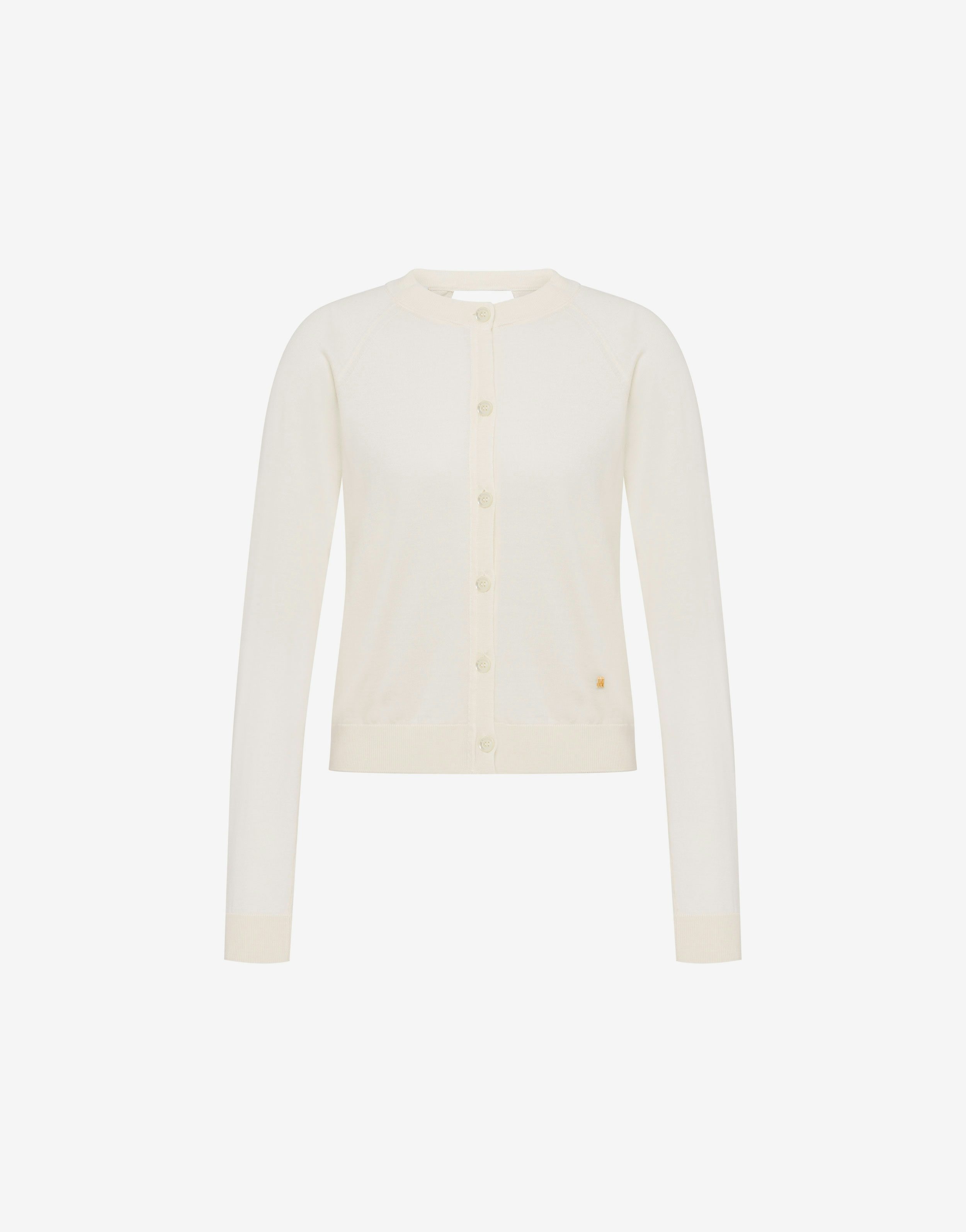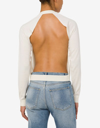 FINE WOOL AND SILK JUMPER WITH MAXI CUT-OUT AT THE BACK, BUTTONS AT THE FRONT, AND SMALL MOSCHINO LETTER M IN GOLD-TONE GALVANISED METAL. REGULAR FIT CREW NECK LONG SLEEVES FABRIC: 70% PURE WOOL, 30% SILK CODE: AEF251E 090805010002 FIT MODEL BUST SIZE: 80 CM MODEL HEIGHT: 180 CM MODEL HIPS: 89 CM MODEL SIZE: 40 CM MODEL WAIST: 60 CM