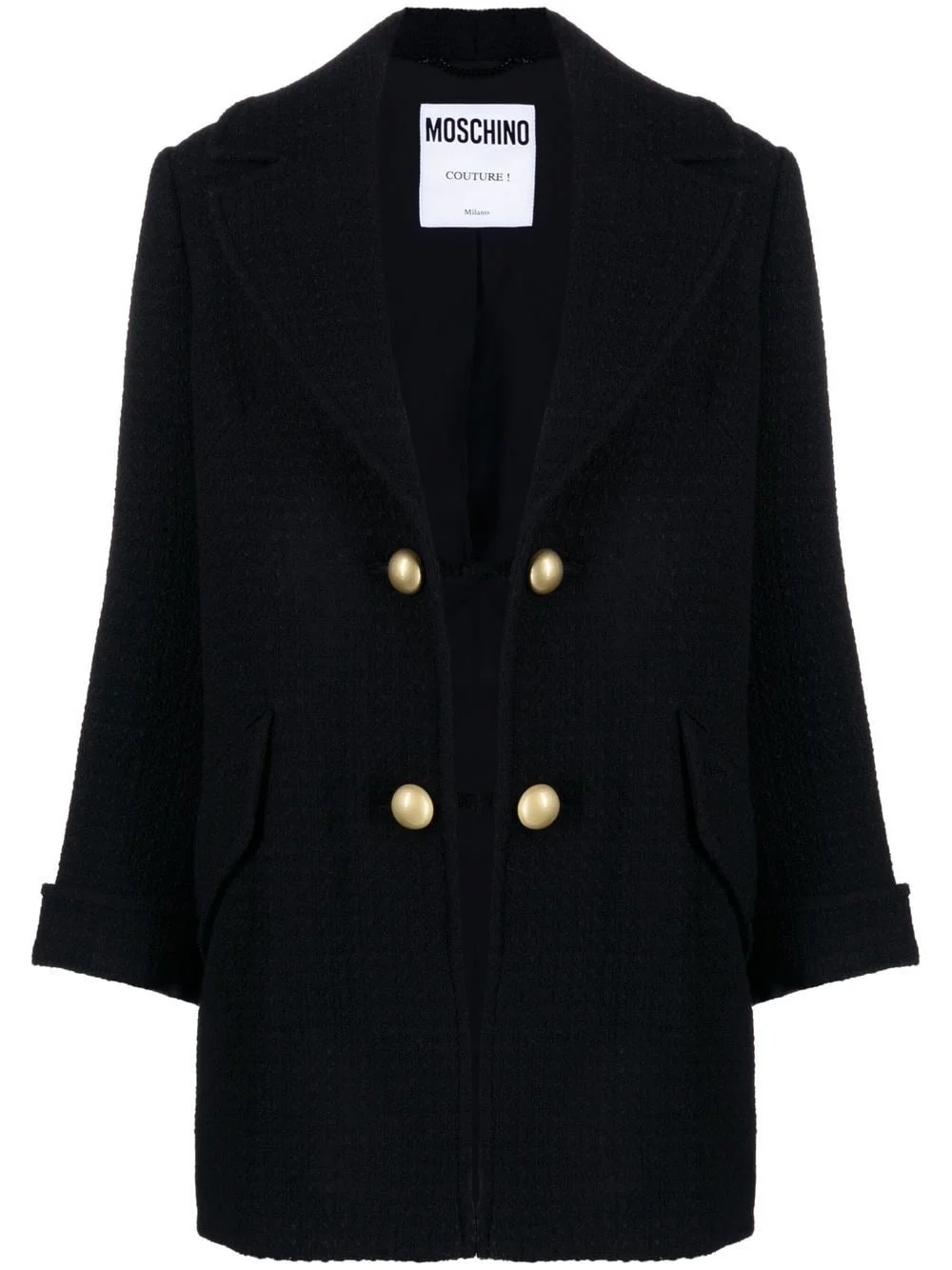 open-front virgin wool coat Moschino offers a contemporary update on classic outerwear. A cross between a cardigan and a tailored coat, this black iteration has an open front connected with a slim strap and gold-tone buttons on either side. Made in Italy Composition Lining: Acetate 89%, Spandex/Elastane 6%, Silk 5% Outer: Virgin Wool 100% SIZE & FIT Model measurements Height 5 ft 10 in(1.79 m) Bust/Chest 31.49 in(80 cm) Hips 35.03 in(89 cm) Waist 23.62 in(60 cm) FittingInformation This piece fits true to size. We recommend you get your regular size Cut for a loose fit Made with a mid-weight non-stretch fabric Washing instructions Dry Clean Only