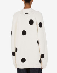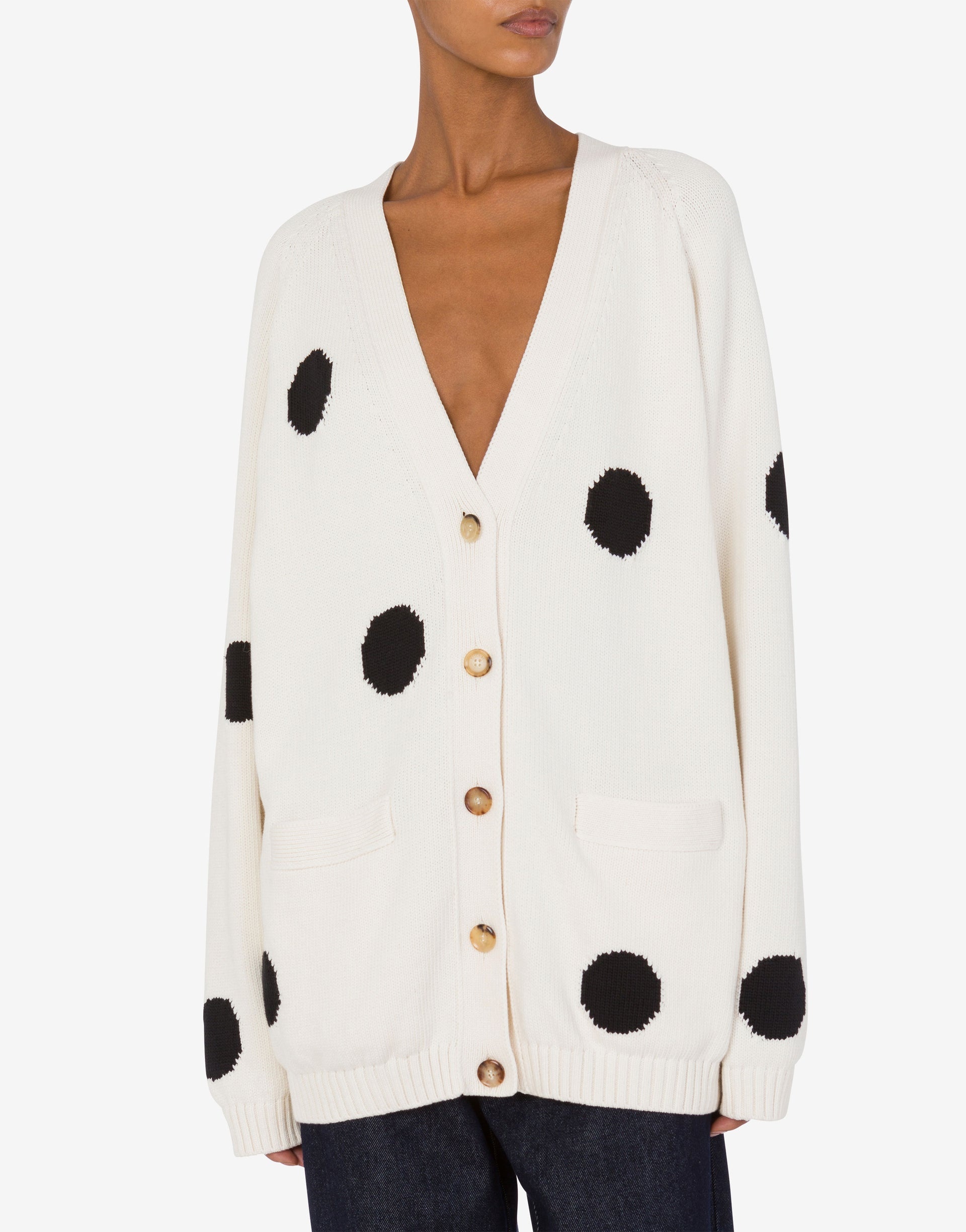 OVERSIZED ORGANIC COTTON BLEND CARDIGAN WITH CONTRASTING POLKA DOT INLAYS. PRODUCT DETAILS OVERSIZE FIT - V-NECKLINE - DROPPED SHOULDERS - TWO FRONT POCKETS - FRONT BUTTON CLOSURE FABRIC: 62% COTTON, 38% POLYAMIDE SKU: AEF251D J092004062003 FITTING & DIMENSIONS - MODEL HEIGHT: 180 CM - MODEL BUST: 80 CM - MODEL WAIST: 60 CM - MODEL HIPS: 89 CM - MODEL SIZE: 40