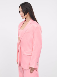 M05CH1NO JEANS jacket in pink, blazer design, paneled construction, notched lapel, structured shoulders, long sleeves, surgeon's cuffs, silver-tone logo-engraved hardware, chest welt pocket, front button closure, side welt flap pockets, back vent, straight hem, oversized fit. Italian Sizing Model is 5'8" wearing size 38. Bust: 32" Waist: 26" Hips: 34.5"