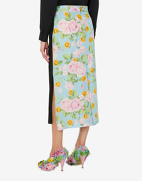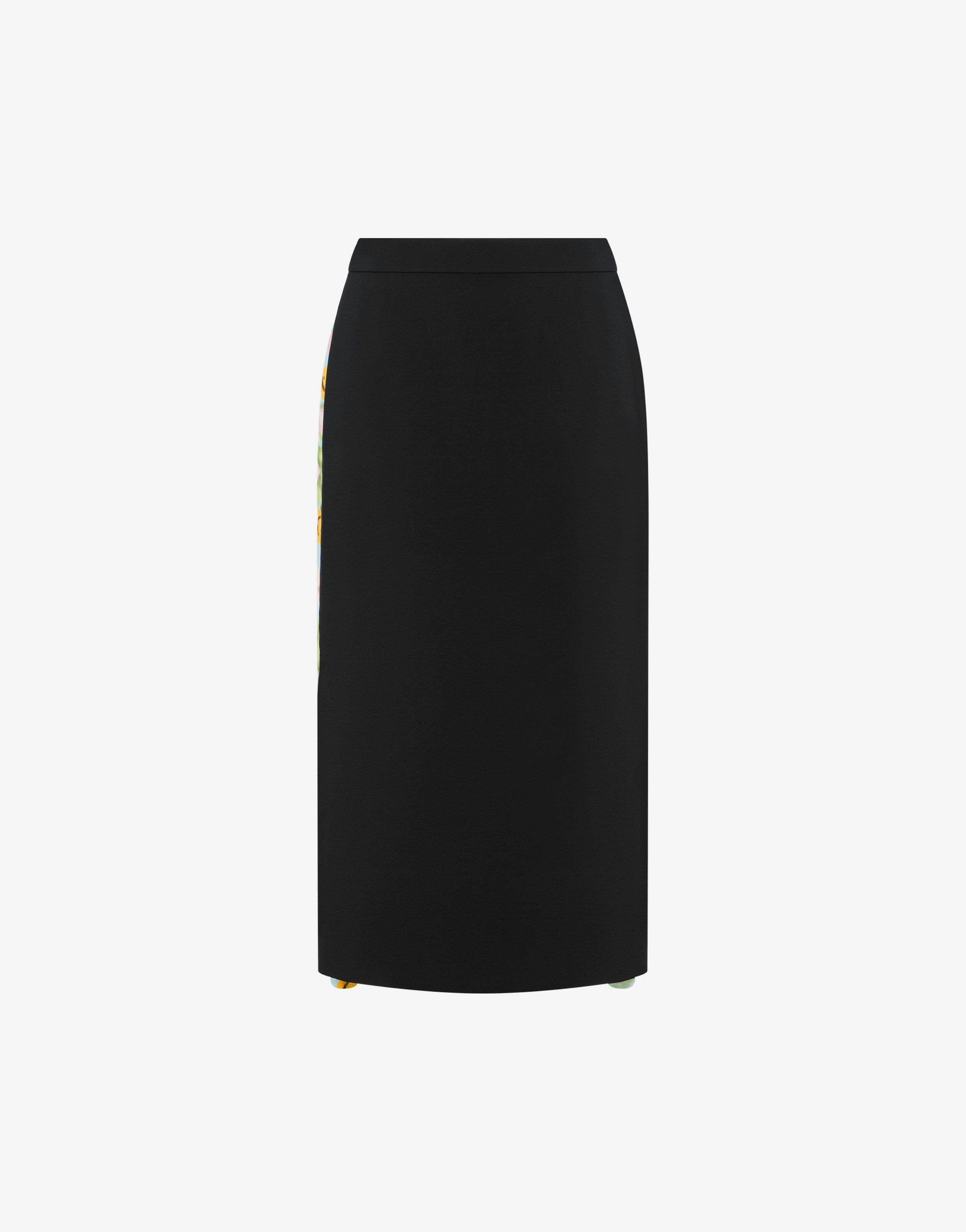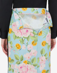 PLAYFUL REINTERPRETATION OF THE CLASSIC PENCIL SKIRT. THE UNIQUE CONSTRUCTION, COMBINING TWO SKIRTS INTO ONE, IS EMPHASIZED BY THE CONTRAST OF FABRICS: BLACK STRETCH CREPE AND SILK SATIN WITH AN ALL-OVER FLOWERS AND SMILEY® PRINT. REGULAR FIT REGULAR WAIST PRINT CREATED IN COLLABORATION WITH SMILEY® TWO SIDE POCKETS SIDE ZIP CLOSURE PARTIAL BACK ZIP CENTER BACK SLIT FABRIC: 6% ELASTAN, 94% VISCOSE LINING: 60% CELLULOSE ACETATE, 40% CUPRO CODE: AEF251D 012704242293 FIT MODEL BUST SIZE: 80 CM MODEL HEIGHT: 180 CM MODEL HIPS: 89 CM MODEL SIZE: 40 CM MODEL WAIST: 60 CM