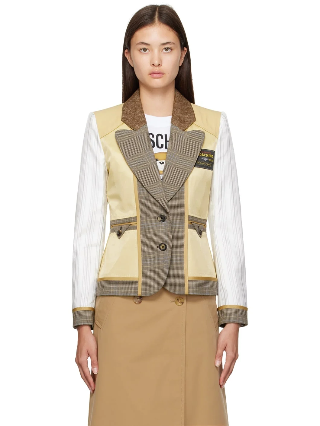Stretch polyester- and virgin wool-blend houndstooth, acetate-blend Oxford cloth, and acetate-blend twill blazer. · Paneled construction · Felted trim at notched lapel · Two-button closure · Logo patch at chest · Welt pockets · Poplin trim at padded shoulders · Three-button surgeon's cuffs · Full satin lining Supplier color: Brown Body 1: 52% polyester, 43% virgin wool, 5% elastane. Body 2: 52% viscose, 48% cotton. Body 3: 51% acetate, 49% viscose. Lining 1: 100% viscose. Lining 2: 51% acetate, 49% viscose. Made in Hungary 232720F057001