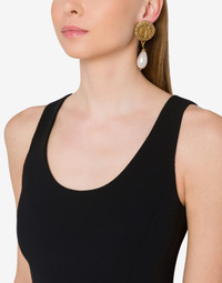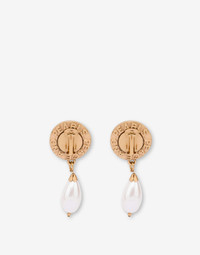 DANGLING EARRINGS WITH A DOUBLE CLIP ALSO PLACED ON THE FRONT PART OF THE EARRING, SIMULATING AN 'ERROR' IN THE WAY IT IS WORN. DISTINCTIVE ELEMENTS ARE THE PEARLS AND THE 'PEACE AND PEARLS' INSCRIPTION IN RELIEF. PEARL PENDANT GOLDEN GALVANIC DECORATIVE CLIP ON THE FRONT CLIP CLOSURE ON THE BACK FABRIC: 10% BRASS, 40% RESIN, 50% ZAMAK CODE: AEF24221916884741607