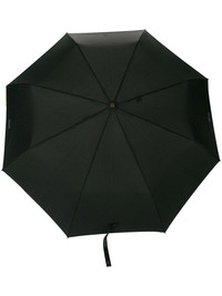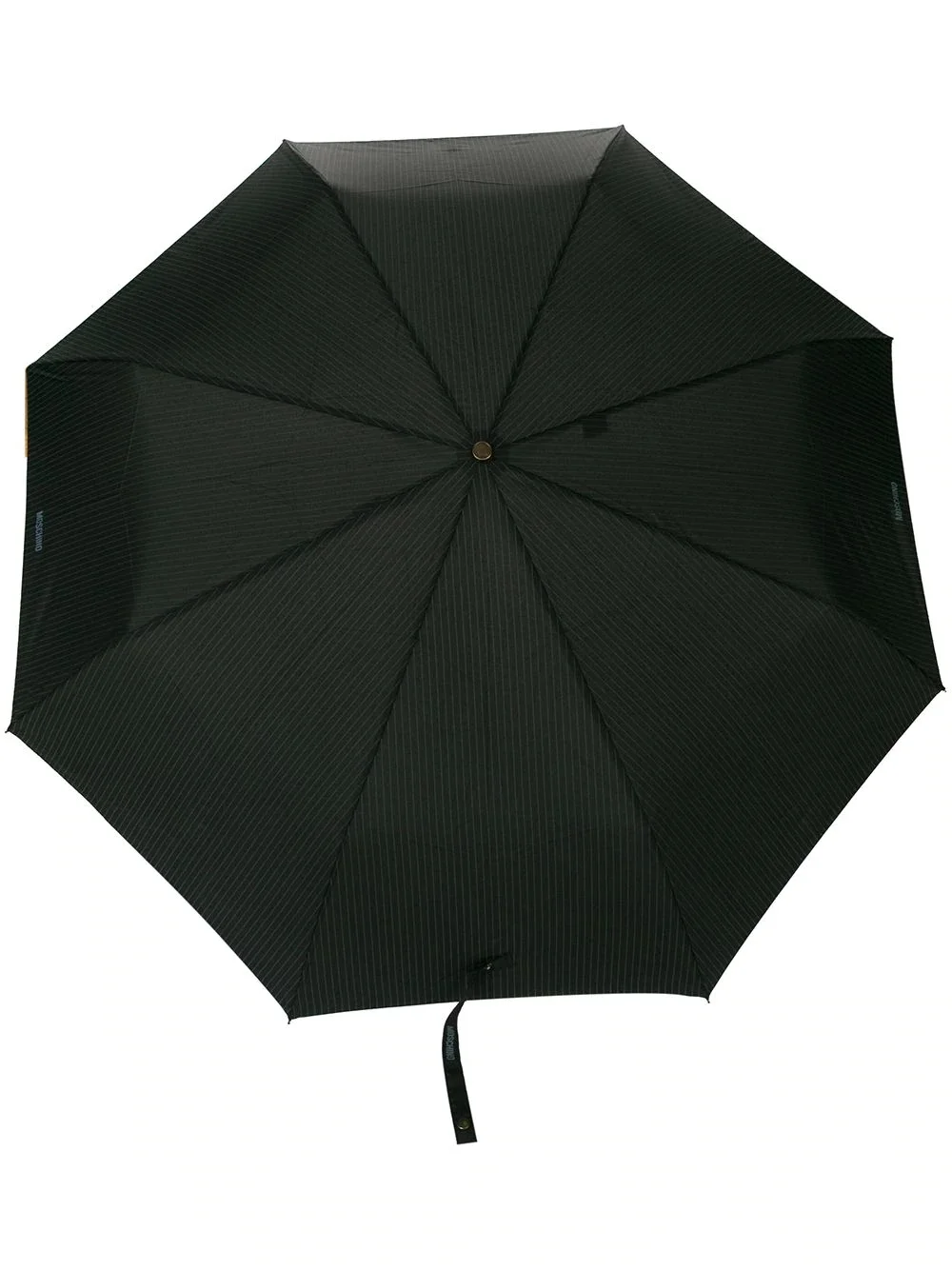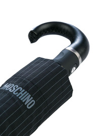 pinstripe umbrella Jeremy Scott creates cool pop culture inspired clothing under the guise of Moschino for the modern streetwear aficionado. This black pinstripe umbrella from Moschino features a curved handle and printed logo details, as well as a matching cover for when it's not in use. Imported Composition Polyester 100%