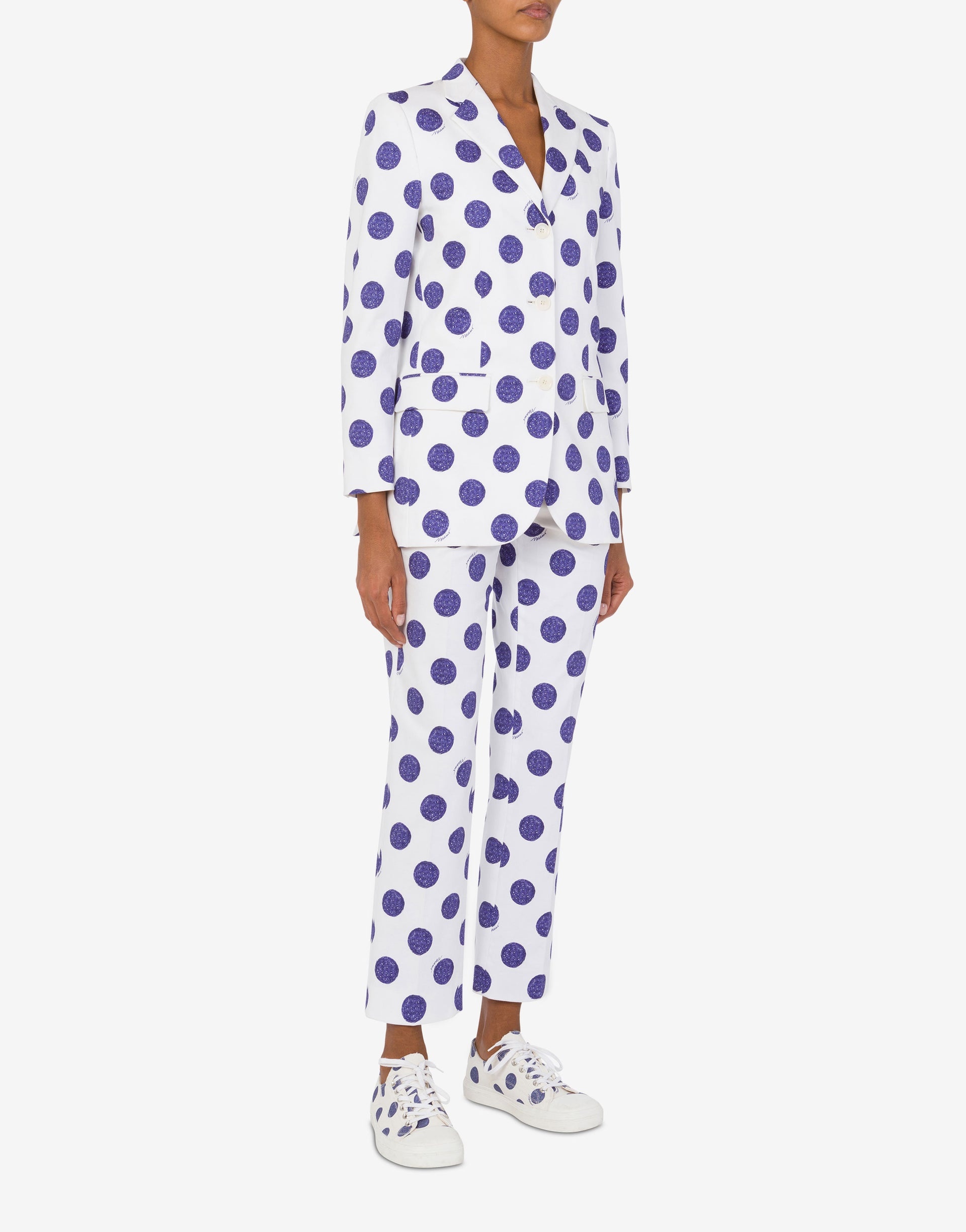 SINGLE-BREASTED JACKET IN STRETCH COTTON SATIN WITH A PEN-DRAWN POLKA DOT EFFECT PRINT. PRODUCT DETAILS SLIM FIT - ALL-OVER POLKA DOT PRINT - THREE FRONT POCKETS - BUTTONED SLEEVE HEM - TWO BACK SLITS - FRONT BUTTON CLOSURE - LINED - TWO INTERNAL POCKETS FABRIC: 97% COTTON, 3% ELASTAN - LINING: 60% CELLULOSE ACETATE, 40% CUPRO SKU: AEF251D A050104541002 FITTING & DIMENSIONS - MODEL HEIGHT: 180 CM - MODEL BUST: 80 CM - MODEL WAIST: 60 CM - MODEL HIPS: 89 CM - MODEL SIZE: 40