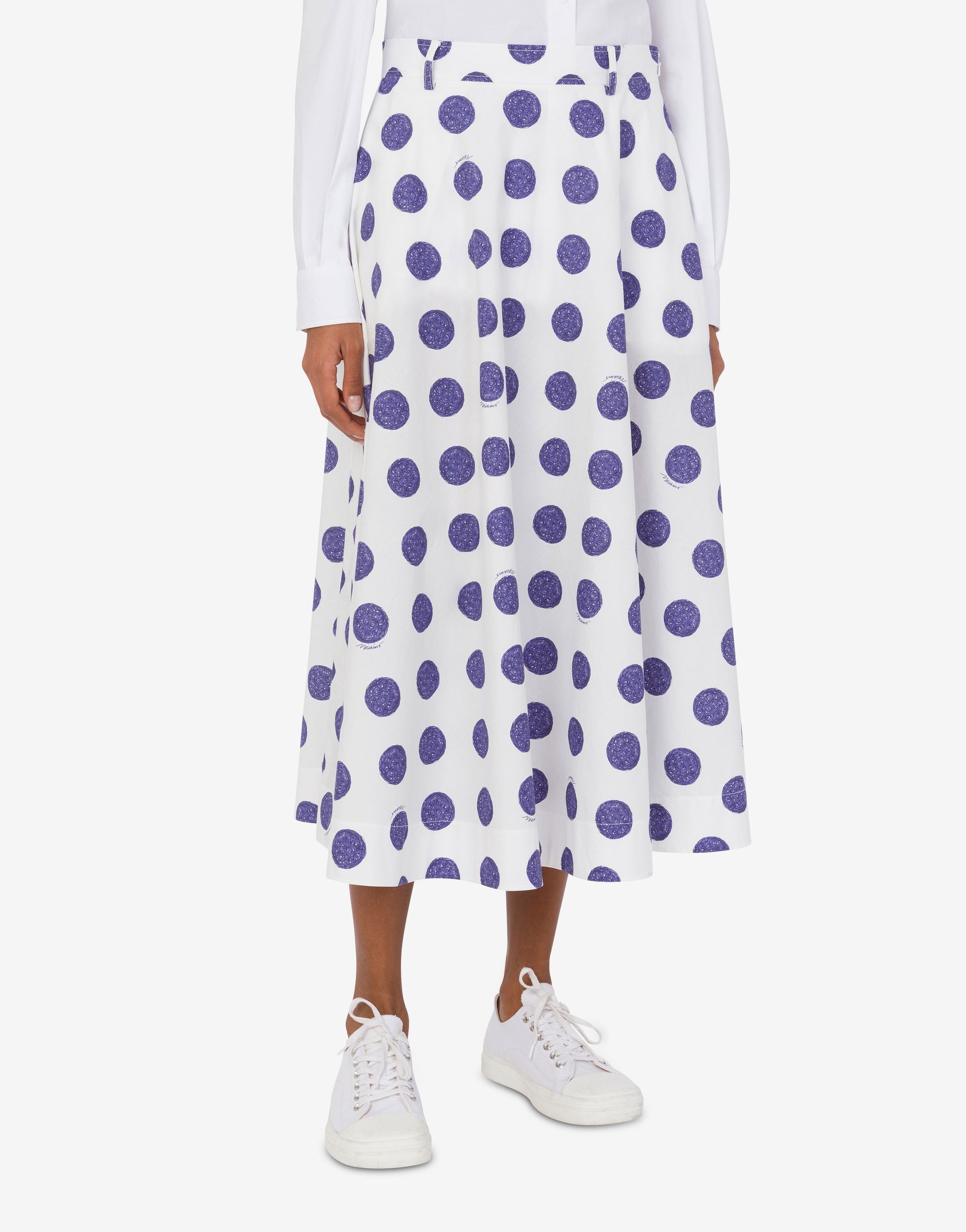 LONGUETTE SKIRT IN COTTON POPLIN WITH A PEN-DRAWN POLKA DOT EFFECT PRINT. THE CUT IS A-LINE FLARED. PRODUCT DETAILS A-LINE FIT - ALL-OVER POLKA DOT PRINT - HIGH WAIST - BELT LOOPS - TWO SIDE POCKETS - SIDE ZIP CLOSURE FABRIC: 100% COTTON SKU: AEF251D A013804501002 FITTING & DIMENSIONS - MODEL HEIGHT: 180 CM - MODEL BUST: 80 CM - MODEL WAIST: 60 CM - MODEL HIPS: 89 CM - MODEL SIZE: 40