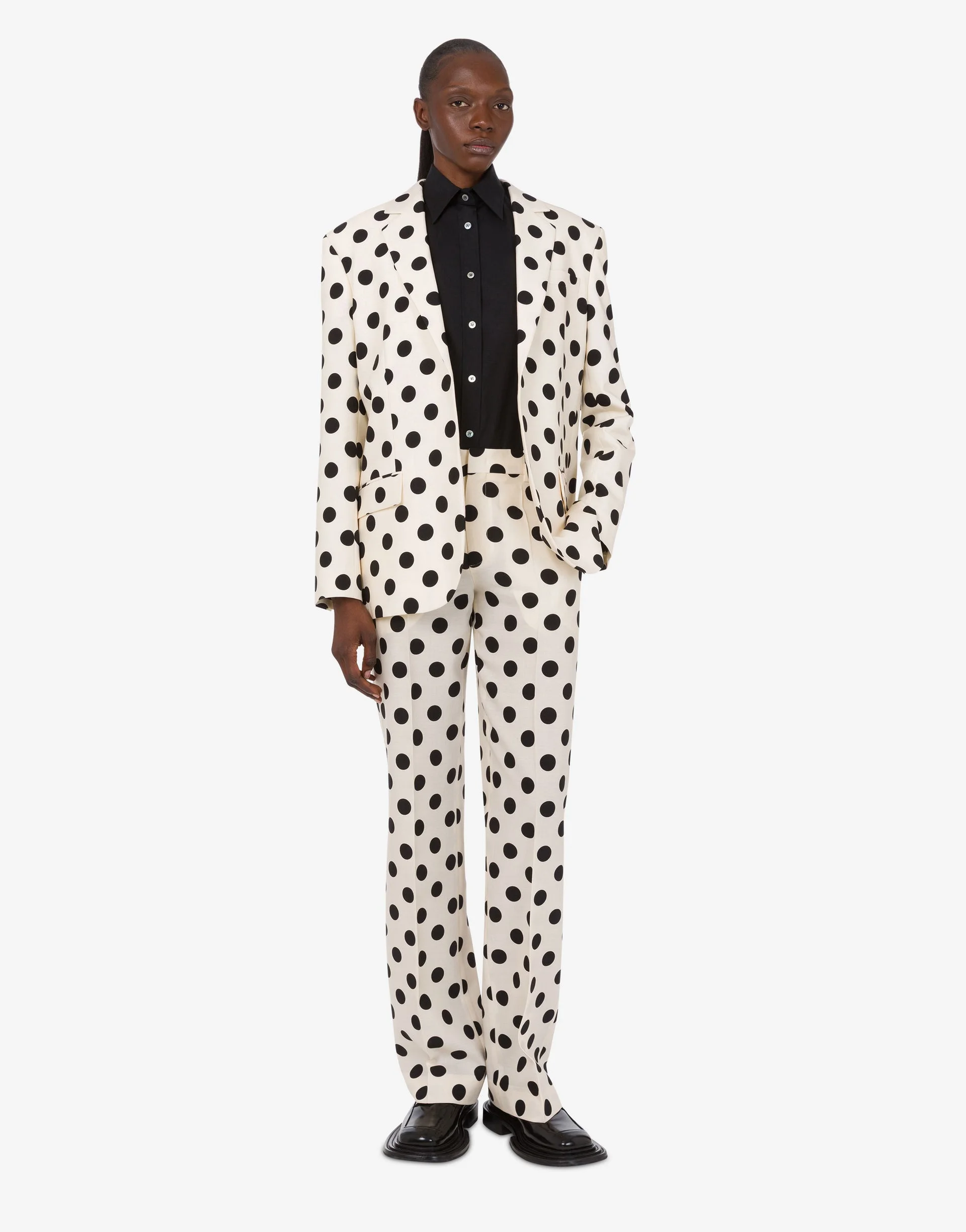 THE FALL/WINTER 2025 COLLECTION FEATURES THE WOOL PANT WITH ALL OVER POLKA DOT PRINT. PRODUCT DETAILS REGULAR FIT - REGULAR WAIST - TWO SIDE POCKETS - BELT LOOPS AT WAIST - BACK POCKET - FRONT CLOSURE WITH COVERED ZIPPER AND HOOK FABRIC: 100% PURE WOOL SKU: AEF252D A031454511003