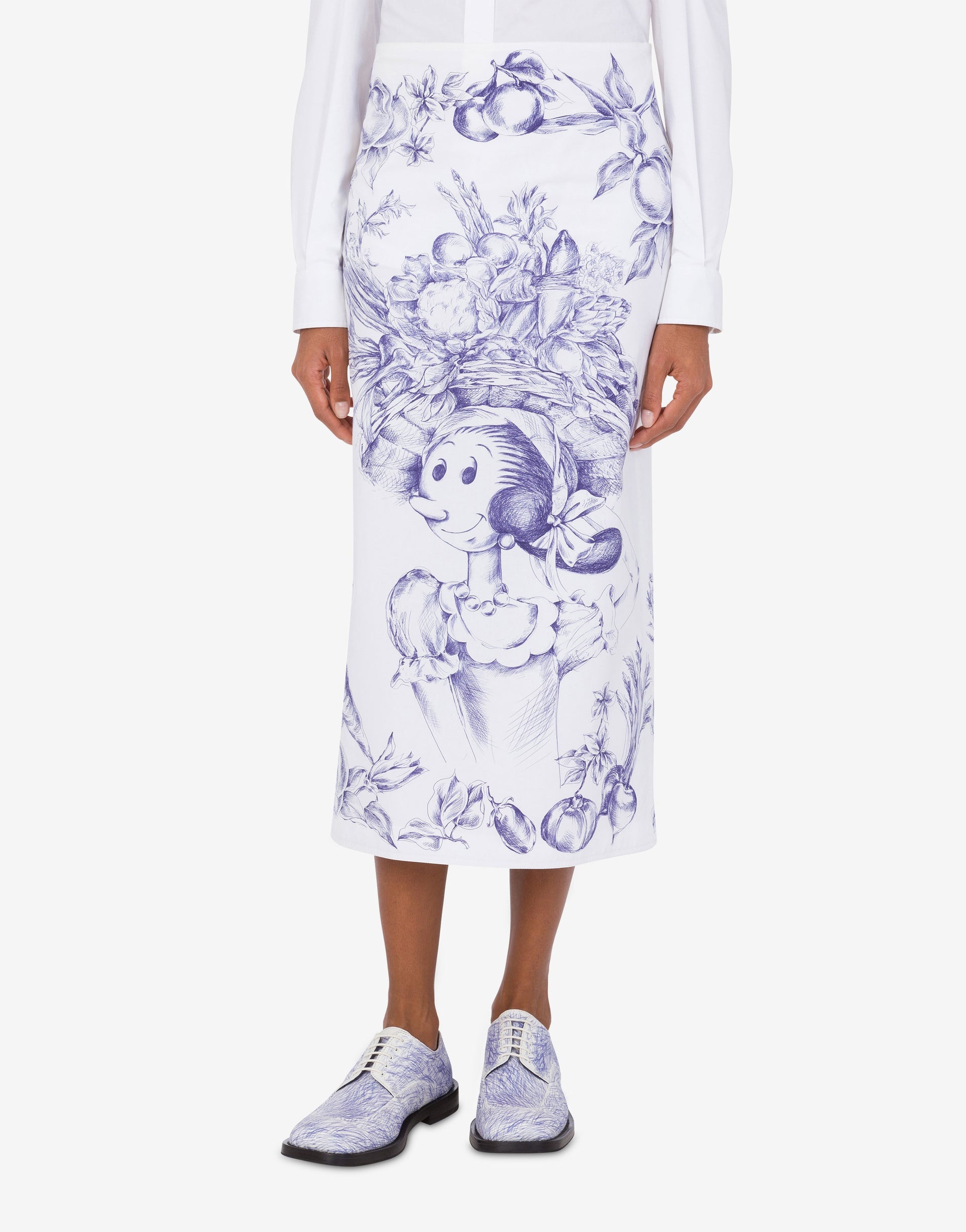 LONGUETTE SKIRT IN COTTON POPLIN WITH OLIVIA PRINT. THE CUT IS STRAIGHT, FEATURING A CENTRAL BACK SLIT. PRODUCT DETAILS REGULAR FIT - REGULAR WAIST - SIDE ZIP CLOSURE FABRIC: 100% COTTON SKU: AEF251D A012304503002 FITTING & DIMENSIONS - MODEL HEIGHT: 180 CM - MODEL BUST: 80 CM - MODEL WAIST: 60 CM - MODEL HIPS: 89 CM - MODEL SIZE: 40