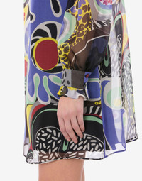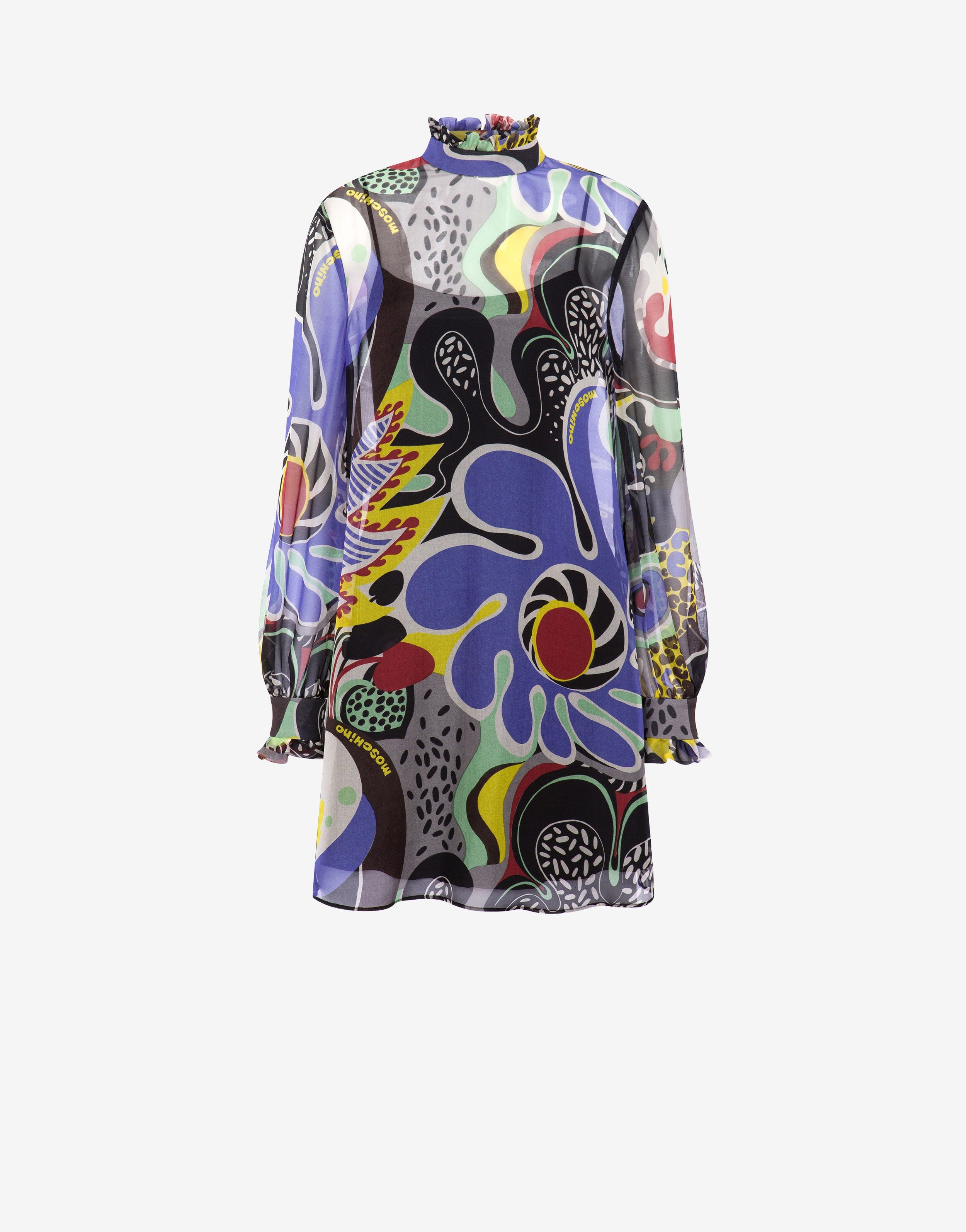 Silk chiffon dress with all-over psychedelic print, remborsé-look sleeves and ruffled high neck. - Regular fit - Long sleeves - Buttoned cuffs - Ruffled sleeve hems - Keyhole cut-out on the back with button at the neck - Removable black slip Fabric:100% Silk Code: AEF231E 042305531555 FIT - Regular fit - Model bust size : 82 - Model height : 1.78 cm - Model Hips : 88 cm - Model size : 40 - Model waist : 60 cm