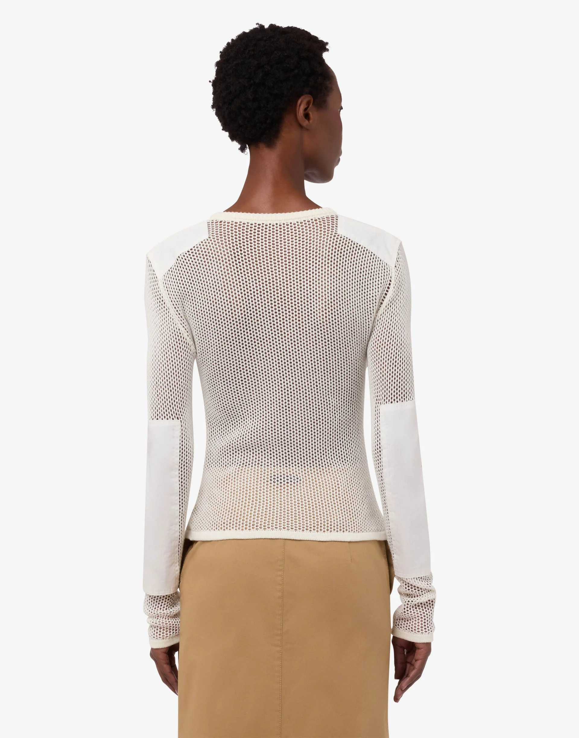 THE SPRING/SUMMER 2026 COLLECTION FEATURES PURE COTTON MESH KNITWEAR WITH CROCHETED SWAN-SHAPED EMBROIDERY. PRODUCT DETAILS REGULAR FIT - CREW NECK - CONTRASTING PATCHES ON SHOULDERS AND SLEEVES - PARTIAL BUTTON CLOSURE AT FRONT FABRIC: 100% COTTON SKU: AEF261D A090404810003