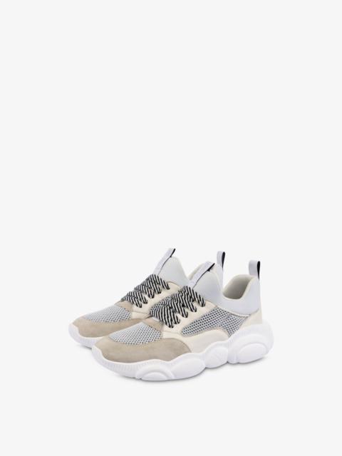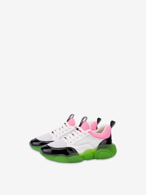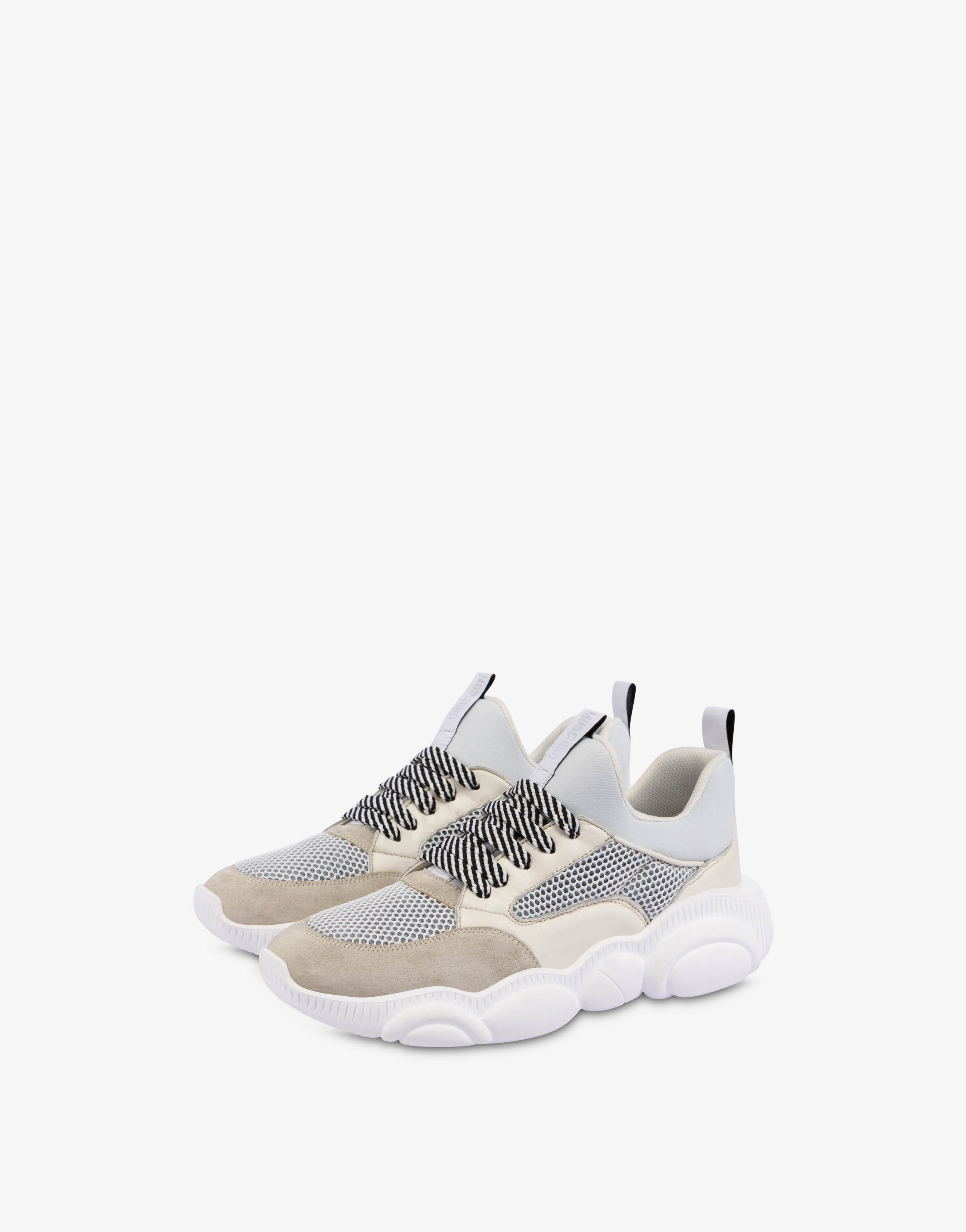 Running sneakers made of 100% recycled materials with Moschino Teddy Bear shaped sole. - Wide Fit - Upper in eco-friendly materials - Lacing on the front - Pull with jacquard logo on the front - Loop with logo on the back for easy fit - Recycled rubber Teddy sole Bottom:100% Rubber Lining:50% Calfskin, 1% Elastan, 30% Polyamide, 19% Polyester Upper:25% Calfskin, 1% Elastan, 5% Polyamide, 60% Polyester, 2% Polyethylene Terephthalate, 7% Polyurethane Code: POLMA15103G1EMQG10A FIT - Wide Fit - Heel Height : 3 cm - Model bust size : 80 - Model height : 178 cm - Model Hips : 89 cm - Model size : 40 - Model waist : 60 cm