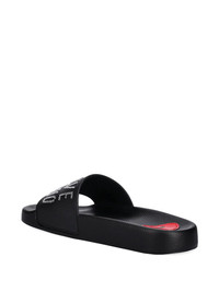 rhinestone-embellished slides Highlights - Black - Logo embellishment - Round open toe - Flat sole Imported Composition Sole: Rubber 100% Outer: Polyurethane 100% Lining: Rubber 100%