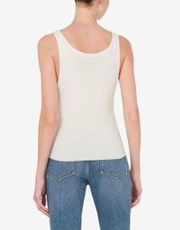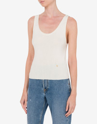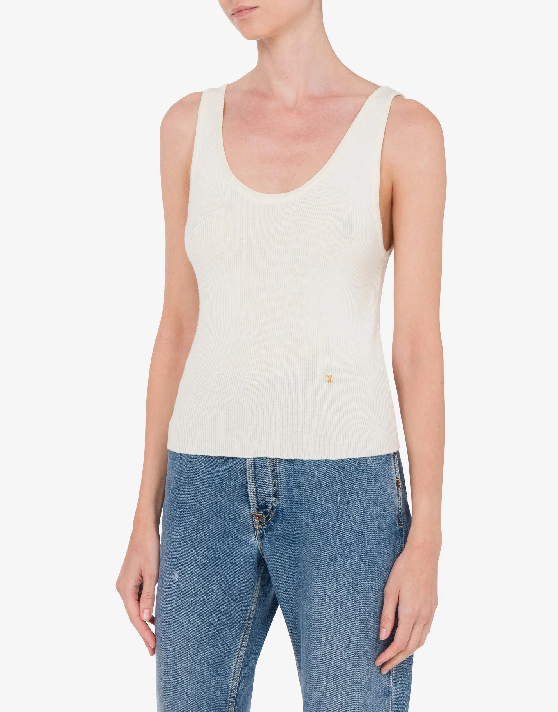 SUPERFINE WOOL AND SILK TANK TOP WITH SMALL MOSCHINO LETTER M IN GOLD-TONE GALVANISED METAL. PRODUCT DETAILS REGULAR FIT - METAL M LETTER - ROUND NECKLINE - SLEEVELESS FABRIC: 70% PURE WOOL, 30% SILK SKU: AEF251E A088205010002 FITTING & DIMENSIONS - MODEL HEIGHT: 180 CM - MODEL BUST: 80 CM - MODEL WAIST: 60 CM - MODEL HIPS: 89 CM - MODEL SIZE: 40