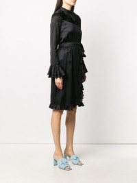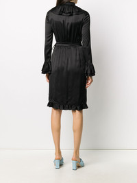ruffled wrap dress It's a wrap, your search for the perfect versatile dress has met its end. This ruffled wrap dress from Moschino ticks all the boxes and can be dressed up or down. You'll want to show it off on the regular. Made in Italy Composition Viscose 72%, Silk 14%, Modal 14% SIZE & FIT Model measurements Height 5 ft 10 in(1.78 m) Bust/Chest 31.49 in(80 cm) Hips 36.22 in(92 cm) Waist 25.59 in(65 cm) FittingInformation This piece fits true to size. We recommend you get your regular size Designed for a close fit at the bust and waist, but loose at the hip Made with a mid-weight non-stretch fabric Washing instructions Dry Clean Only