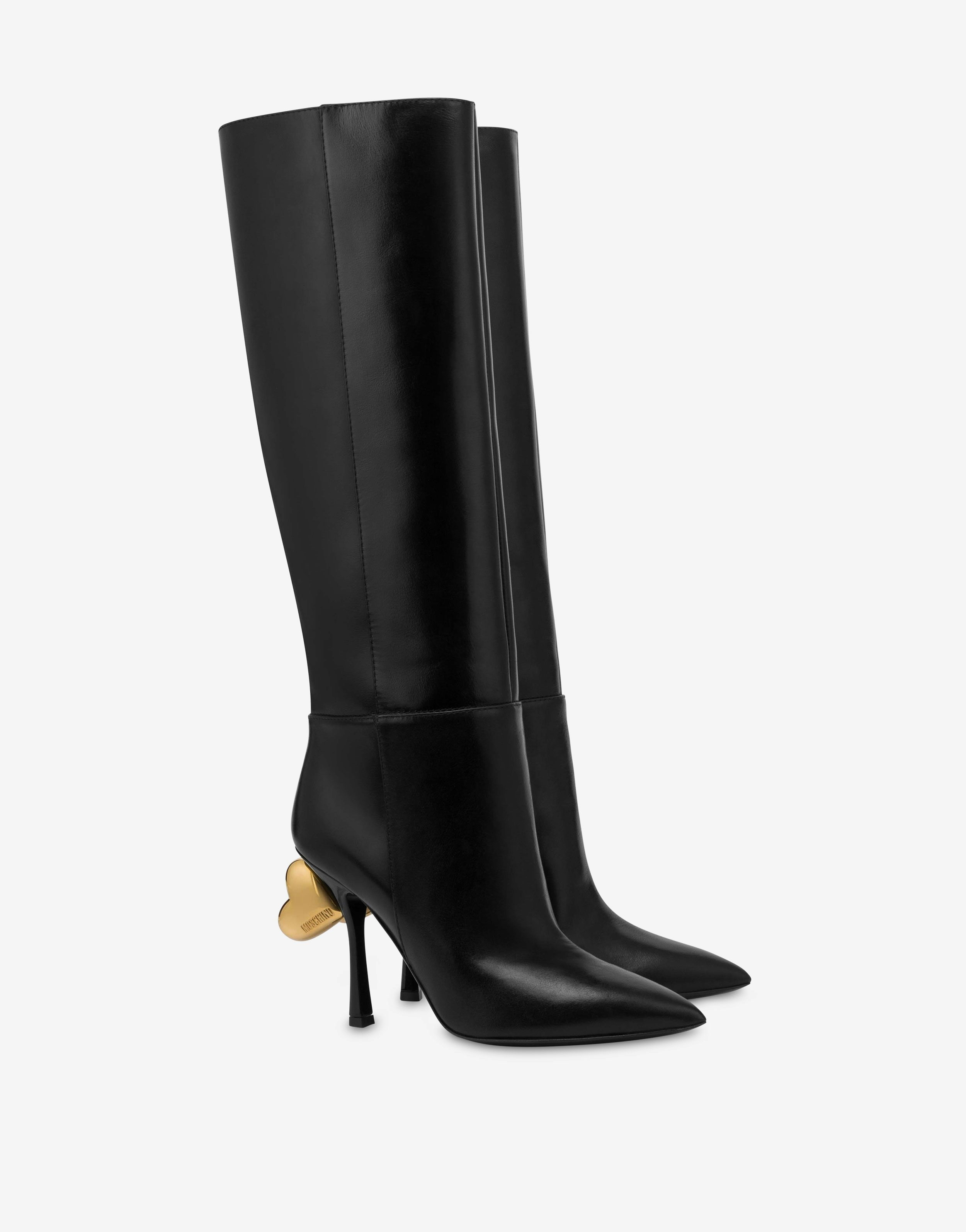 CALFSKIN BOOTS WITH STILETTO HEEL AND GOLD-ELECTROPLATED HEART-SHAPED BRANDED DETAIL. POINTED TOE LEATHER LINING HEEL WITH GOLD HEART LEATHER OUTSOLE BOTTOM: 100% CALFSKIN LINING: 40% GOATSKIN, 60% SHEEPSKIN UPPER: 100% CALFSKIN CODE: POLMA2601AC1LMD5000 FIT HEEL HEIGHT: 10 CM