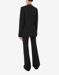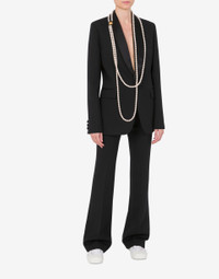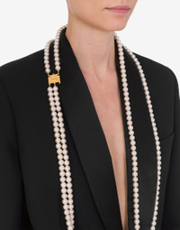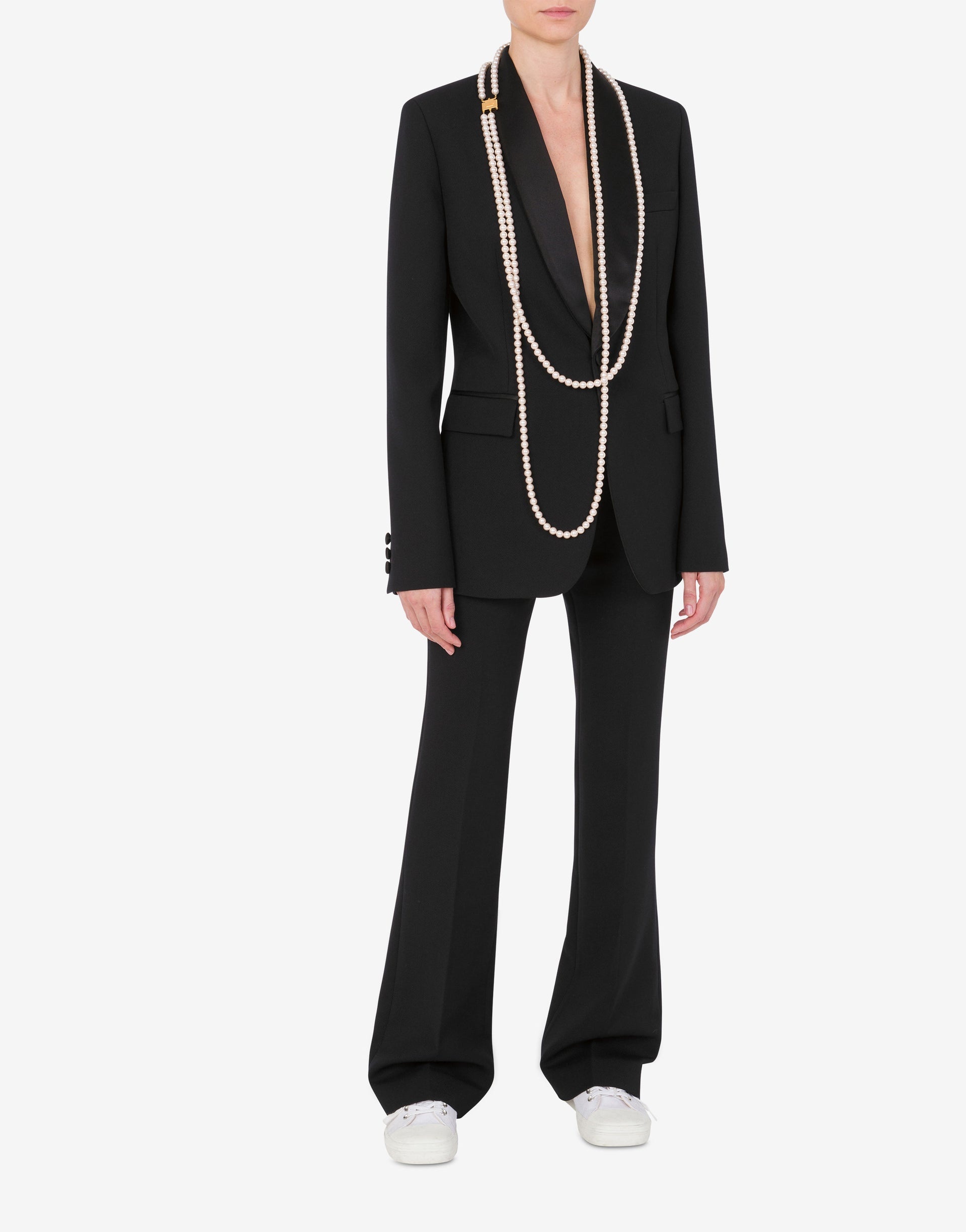 SINGLE-BREASTED JACKET IN DIAGONAL WOOL AND NYLON BLEND, DECORATED WITH MAXI PEARL NECKLACES. TAILORED CUT WITH TONAL SATIN LAPELS IN A GLOSSY FINISH. PRODUCT DETAILS REGULAR FIT - MAXI PEARL NECKLACES WITH GOLD-TONE LOGO DETAIL - BUTTONED SLEEVE HEM - THREE FRONT POCKETS - FRONT BUTTON CLOSURE - PADDED SHOULDERS - LINED - BACK SLIT FABRIC: 55% PURE WOOL, 39% POLYESTER, 6% POLYAMIDE - LINING: 60% CELLULOSE ACETATE, 40% CUPRO SKU: AEF251D A050704131555 FITTING & DIMENSIONS - MODEL HEIGHT: 180 CM - MODEL BUST: 80 CM - MODEL WAIST: 60 CM - MODEL HIPS: 89 CM - MODEL SIZE: 40