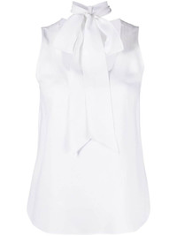 bow-detail sleeveless blouse Moschino briefly steps away from its whimsical aesthetic and takes a rather elegant route with this sleeveless blouse. It offers a contemporary and sophisticated look with an oversized bow fastening at the collar and a delicate white hue. Highlights - White - Crepe texture - Scoop neck - Tie strap - Sleeveless - Curved hem Made In Italy Composition Acetate 70%, Viscose 30% SIZE & FIT Model measurements Height 5 ft 11 in(1.8 m) Bust/Chest 30.7 in(78 cm) Hips 35.03 in(89 cm) Waist 24.4 in(62 cm) FittingInformation Designed for a relaxed fit, this piece allows for comfort and movement when worn Made from a midweight non-stretch fabric This piece fits true to size – take your usual size Washing instructions Dry Clean Only