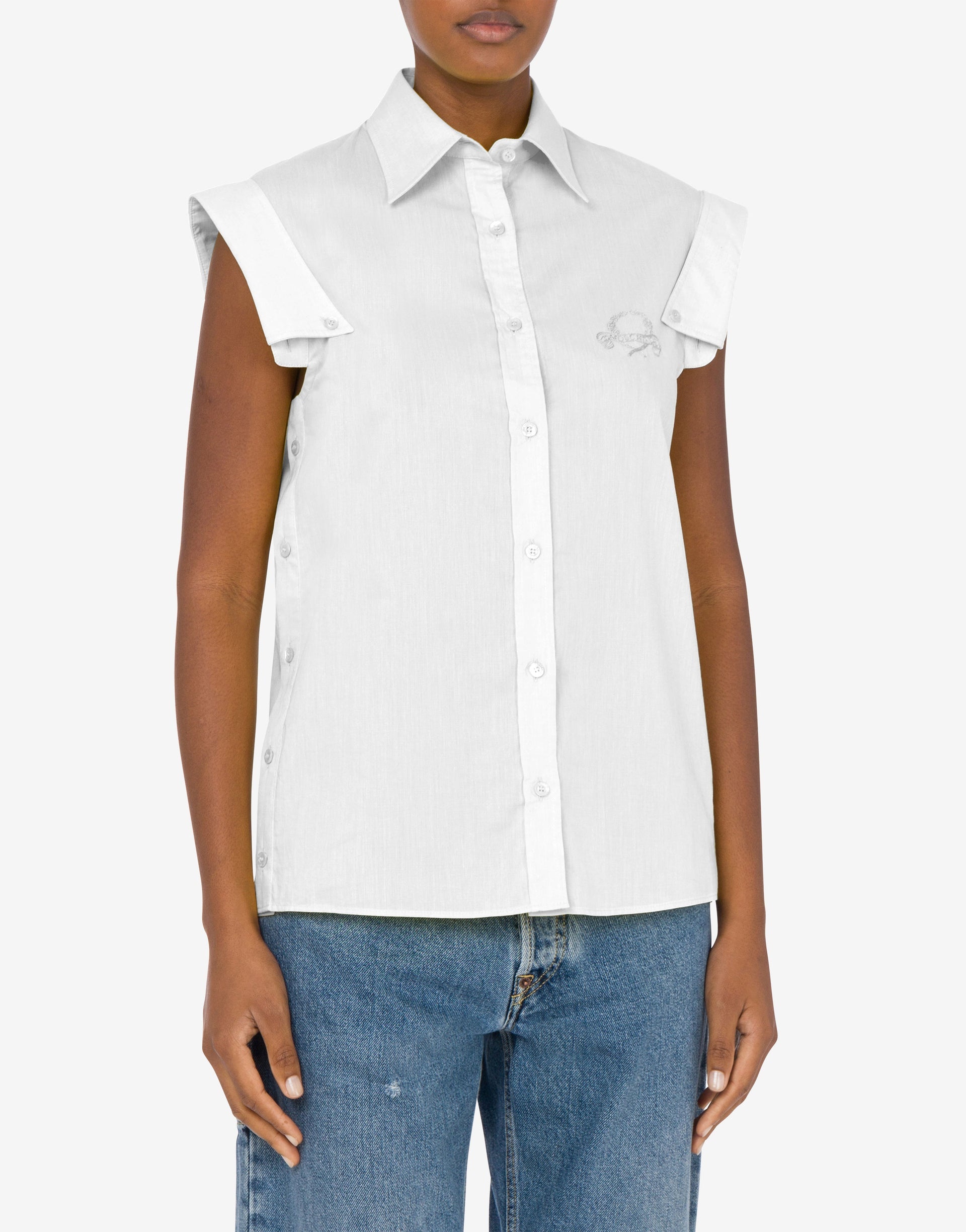 SLEEVELESS YARN-DYED COTTON MUSLIN SHIRT WITH DECORATIVE COLLARS AT THE ARMHOLE AND ARCHIVE LOGO EMBROIDERY WITH LAUREL WREATH. PRODUCT DETAILS REGULAR FIT - CLASSIC COLLAR - EMBROIDERED DETAIL ON THE FRONT - FRONT BUTTON CLOSURE FABRIC: 100% COTTON SKU: AEF251E A022305342001 FITTING & DIMENSIONS - MODEL HEIGHT: 180 CM - MODEL BUST: 80 CM - MODEL WAIST: 60 CM - MODEL HIPS: 89 CM - MODEL SIZE: 40