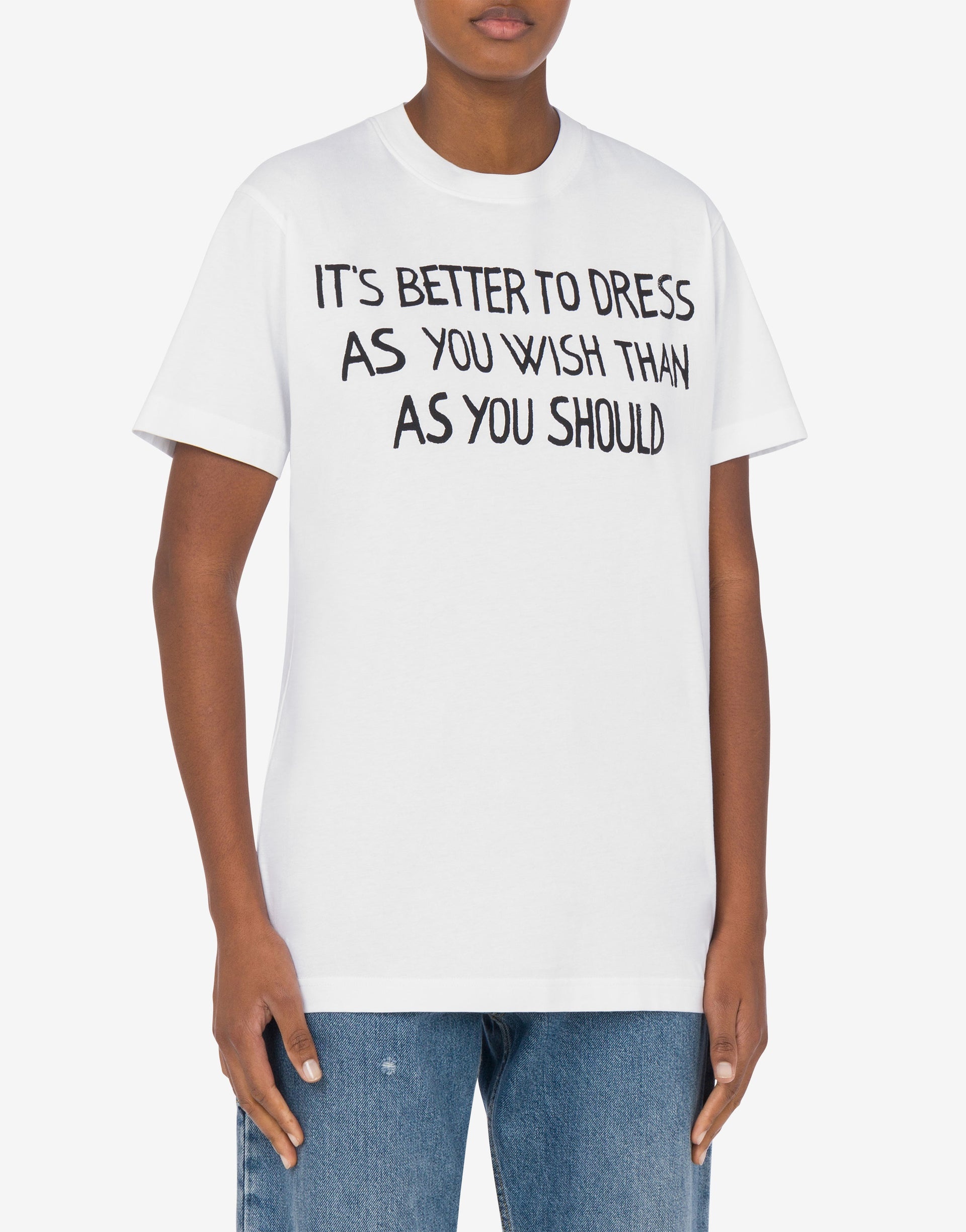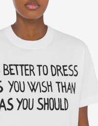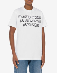 ORGANIC COTTON JERSEY T-SHIRT WITH ARCHIVAL SLOGAN PRINT: “IT'S BETTER TO DRESS AS YOU WISH THAN AS YOU SHOULD.” PRODUCT DETAILS - BACK LOGO PRINT - SHORT SLEEVES FABRIC: 100% COTTON SKU: AEF251E A071105411001 FITTING & DIMENSIONS - MODEL HEIGHT: 180 CM - MODEL BUST: 80 CM - MODEL WAIST: 60 CM - MODEL HIPS: 89 CM - MODEL SIZE: 40