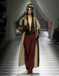 TRENCH COAT IN WOOL AND COTTON GABARDINE WITH SATIN INSERTS WITH PRINTS INSPIRED BY TIE PATTERNS. WITH A REVERSIBLE CONSTRUCTION, IT CAN ALSO BE WORN ON THE MONOCHROMATIC SIDE. LOOSE FIT ALL-OVER PRINTED SATIN DOUBLE-FACED COLLAR TWO POCKETS ON BOTH SIDES FRONT BUTTON CLOSURE FABRIC: 90% COTTON, 10% WOOL LINING: 52% CELLULOSE ACETATE, 48% VISCOSE CODE: AEF242D 060254201081