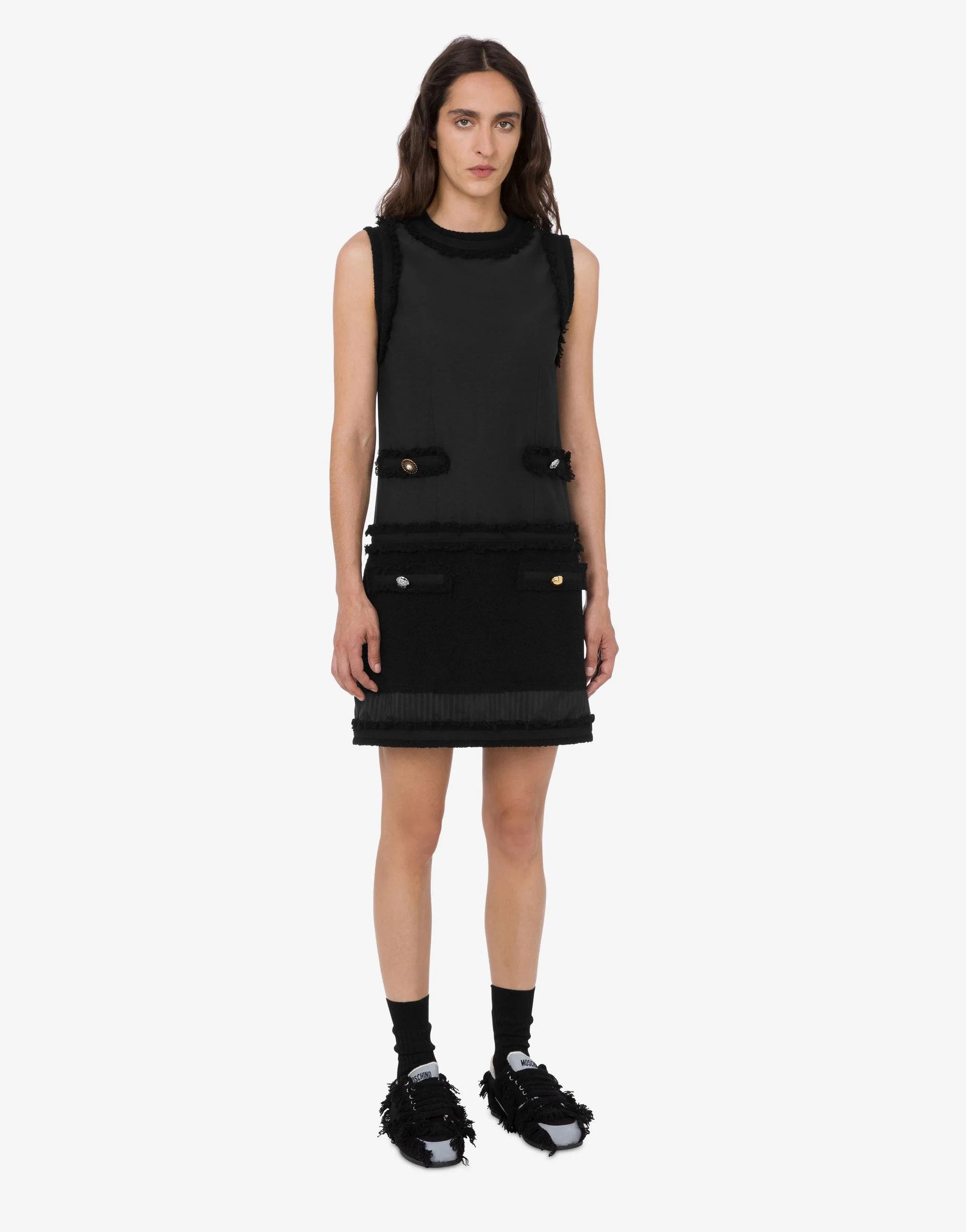 THE RESORT 2026 COLLECTION FEATURES THE STRETCH BOUCLE DRESS WITH FRAYED DETAILS AND DECORATIVE METAL BUTTONS. PRODUCT DETAILS REGULAR FIT - BUTTON WITH SMILEY® - MILITARY BUTTONS - GOLDEN BALL BUTTON - NECKLINE - SLEEVELESS - ZIP BACK CLOSURE - LINED FABRIC: 94% PURE WOOL, 3% VISCOSE, 2% POLYAMIDE, 1% ELASTAN SKU: AEF261E A042305202555