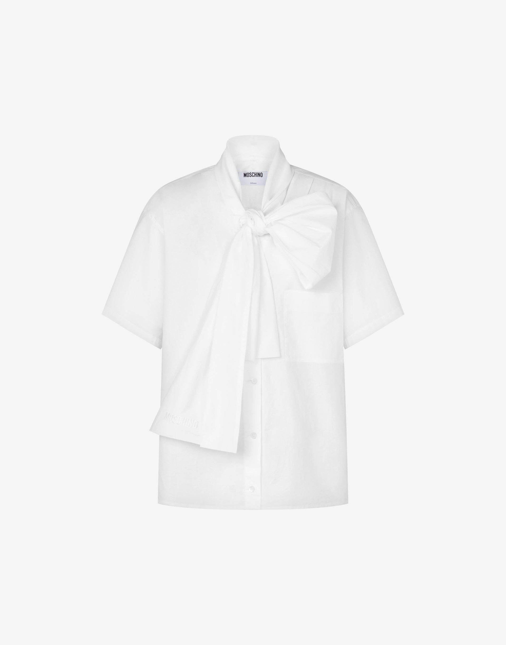 THE RESORT 2026 COLLECTION FEATURES THE STRETCH COTTON POPLIN SHIRT WITH A BOW-TIE LACE-UP LAVALLIER COLLAR AT THE FRONT. PRODUCT DETAILS RELAXED FIT - POCKET ON FRONT - SHORT SLEEVES - BUTTON FRONT CLOSURE FABRIC: 94% COTTON, 6% ELASTAN SKU: AEF261E A020805311001