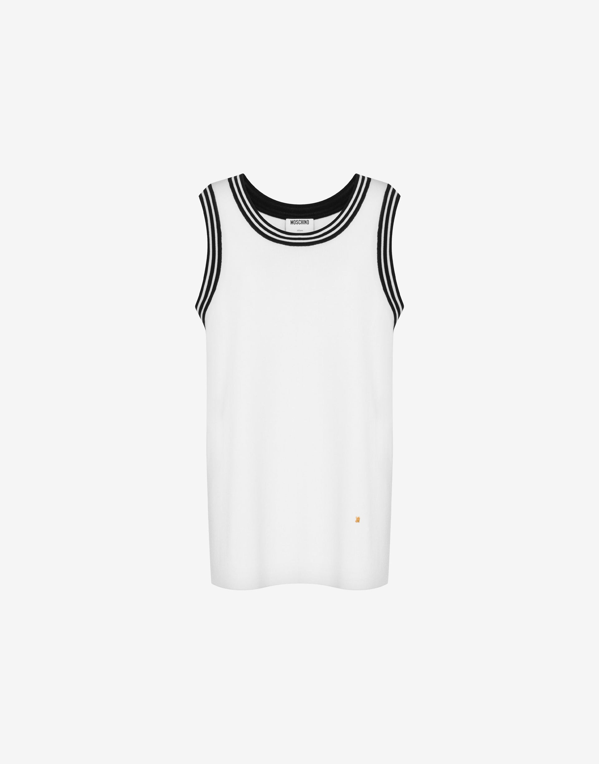 THE RESORT 2026 COLLECTION FEATURES THE STRETCH TOP WITH CONTRASTING STRIPED DETAILS AND SMALL GOLD ELECTROPLATED LETTER M. PRODUCT DETAILS RELAXED FIT - METAL LETTER M - ROUND NECK - SLEEVELESS FABRIC: 65% VISCOSE, 35% POLYAMIDE SKU: AEF261E A088105032001