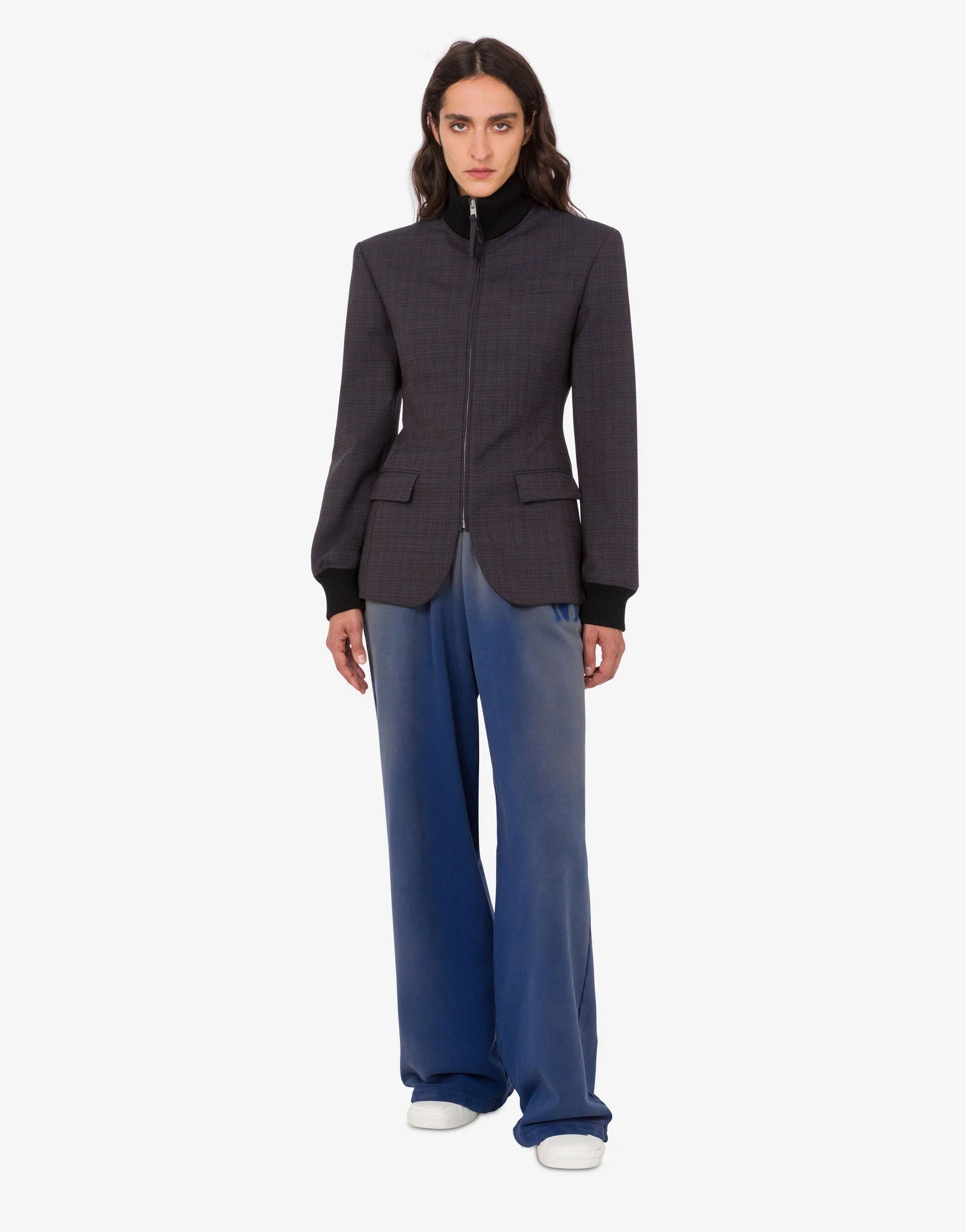 THE RESORT 2026 COLLECTION FEATURES THE STRETCH WOOL-BLEND CLOTH JACKET WITH A HIGH COLLAR AND CONTRASTING RIBBED CUFFS. PRODUCT DETAILS SLIM FIT - PADDED SHOULDER STRAPS - WELT POCKET ON FRONT - TWO FLAP POCKETS - FRONT METAL ZIPPER CLOSURE FABRIC: 53% POLYESTER, 43% PURE WOOL, 4% ELASTAN - LINING: 60% CELLULOSE ACETATE, 40% CUPRO SKU: AEF261E A050205261191