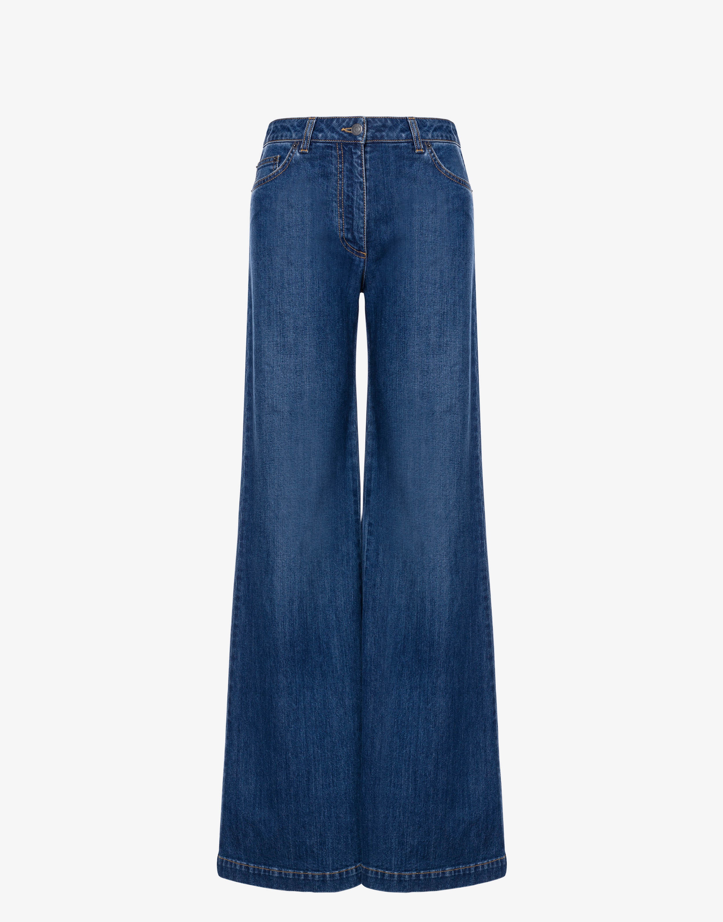 Five-Pocket stretch blue denim palazzo trousers with Moschino Teddy Bear embroidery on the back. - Wide Fit - Regular waist - Embroidery on the back pocket - Three pockets on the front - Two pockets on the back - Belt loops at the waist - Closure with covered zip and button Fabric:98% Cotton, 2% Elastan Code: AEF221E 032005221290 FIT - Wide Fit - Model bust size : 80 - Model height : 178 cm - Model Hips : 89 cm - Model size : 40 - Model waist : 60 cm